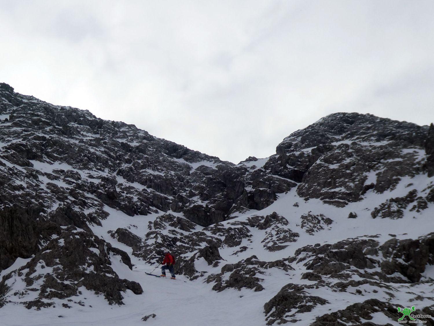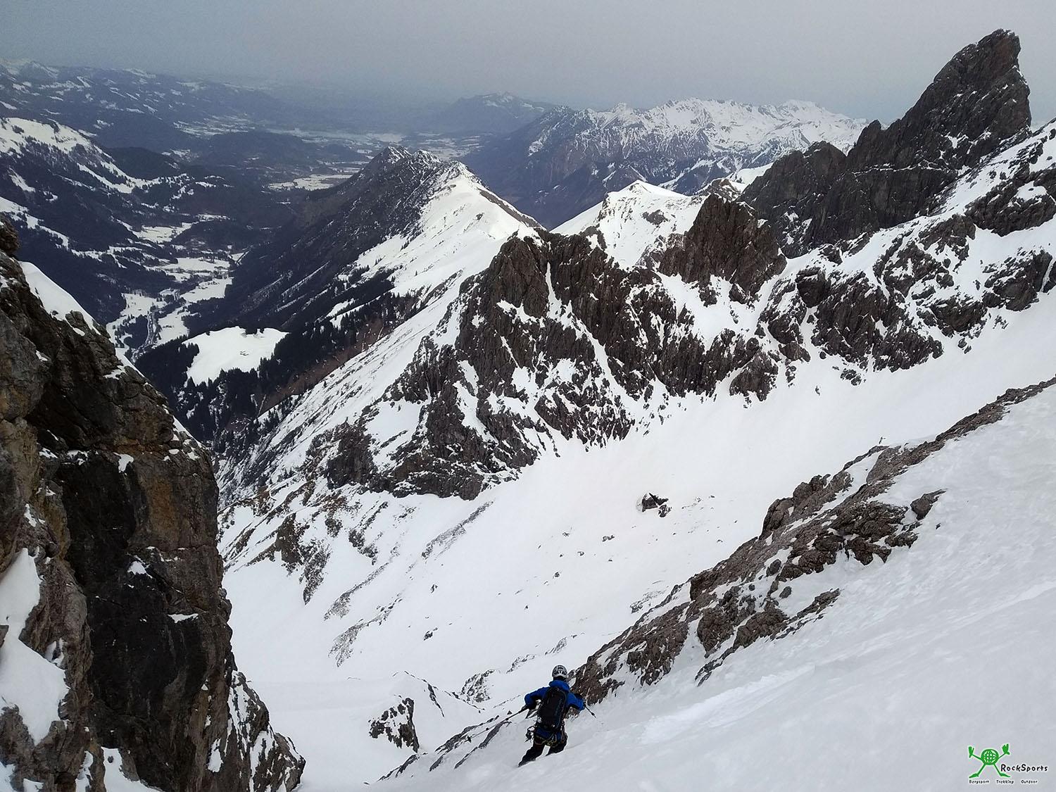 im Abstieg wählten wir unterhalb der Gipfelrinne den direkten Weg über die bei uns mit sehr grieseligem Schnee bedeckte Flanke südlich unserer Aufstiegsrippe.