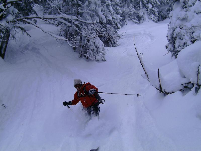 An einem umgefallenen Baum in der grundlos schneegefüllten Rinne seilten wir die ersten 55m ab. Eine Abalakov später standen wir wieder bei unseren Ski.
