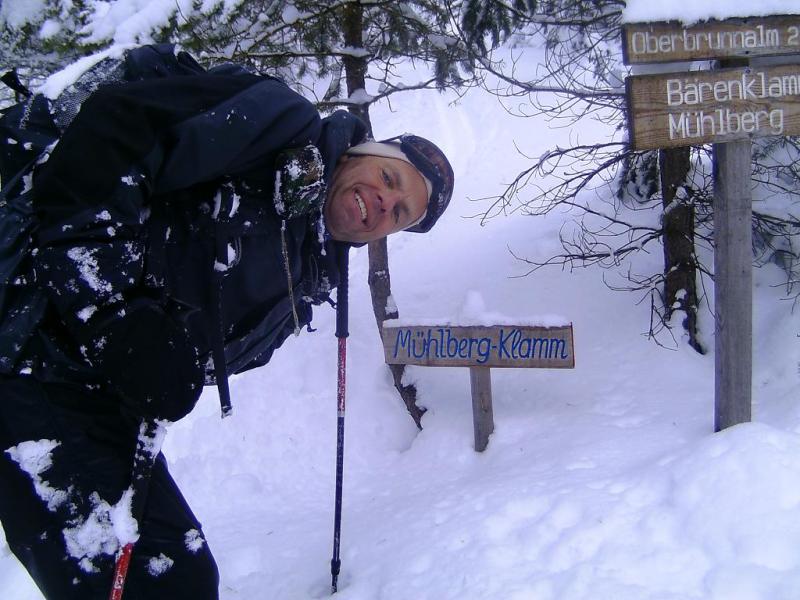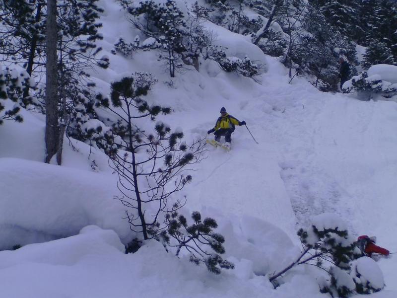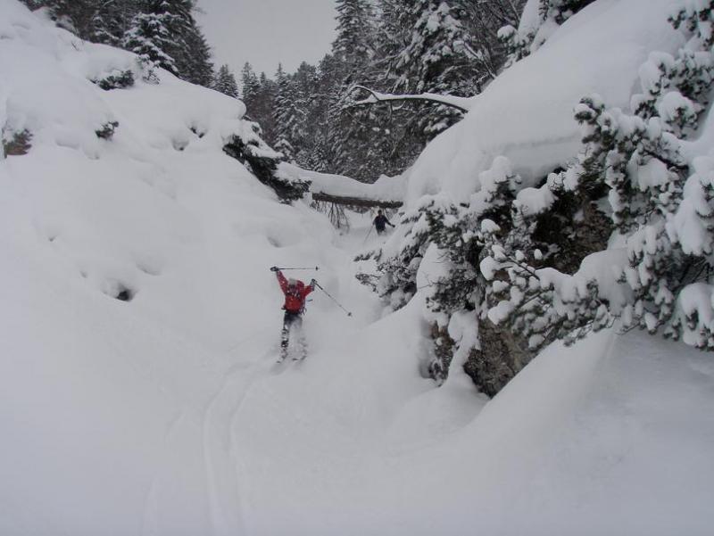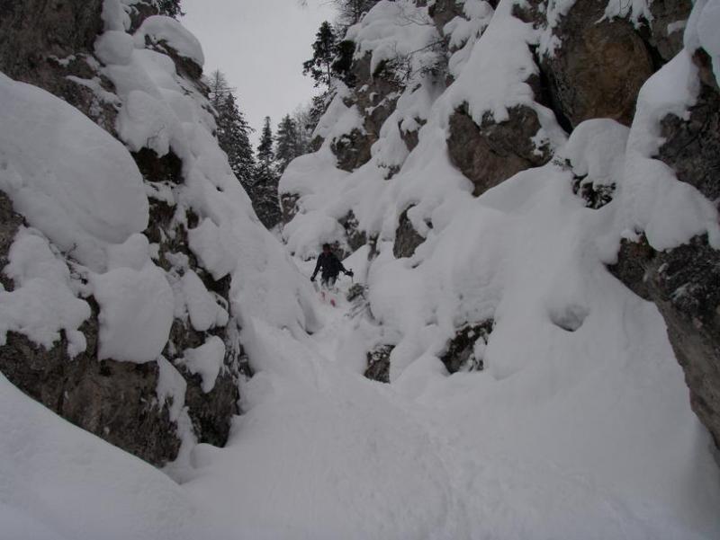 Der Aufsteigsweg ist objektiv recht sicher. Wir wussten aber noch eine Spezialabfahrt vom letzten mal. Auf rund 1.500 Meter fuhren wir rechts in den steilen Wald ein. Grundsätzlich hält man sich immer zwischen der mächtigen und stark felsdurchsetzten Mittagskopfklamm und der kleineren, dafür aber teilweise extrem engen Mühlbergklamm und versucht, immer entlang des Rückens den Weg in Richtung Scharnitz zu finden. Hier kamen wir etwas zu weit nach links, sodaß wir uns in der Mühlbergklamm wiederfanden. Nun folgte eine abenteuerliche Abfahrt - man könnte es "Ski-Canyoning" nennen :-) Einige mächtige Stürze, Abfahrten über vereiste Wandstellen und/oder Flugeinlagen über selbige, so kommt man in der Nähe des Parkplatzes auf die Zubringerstrasse - ohnehin gibt es keine Chance aus der Klamm zu entfliehen....