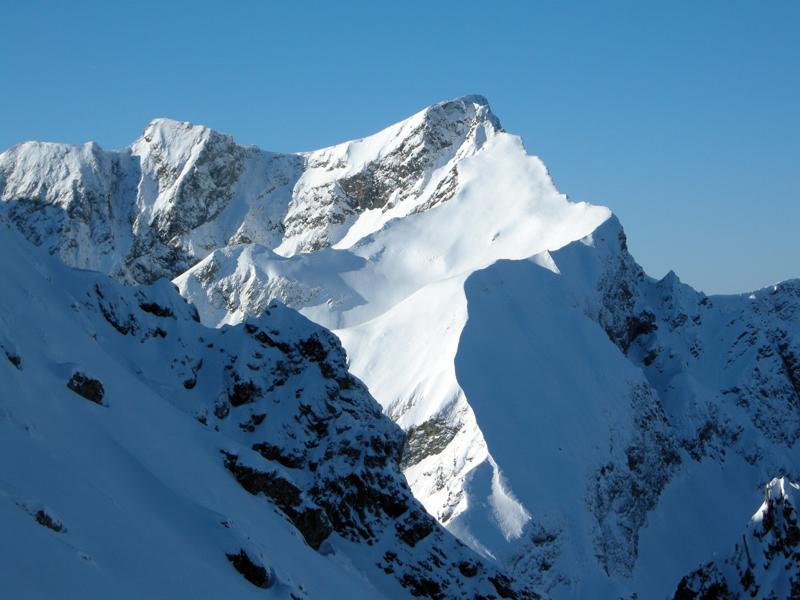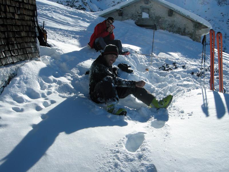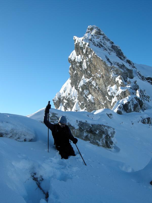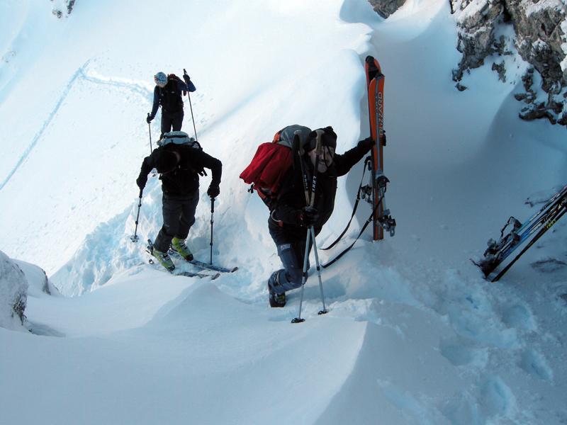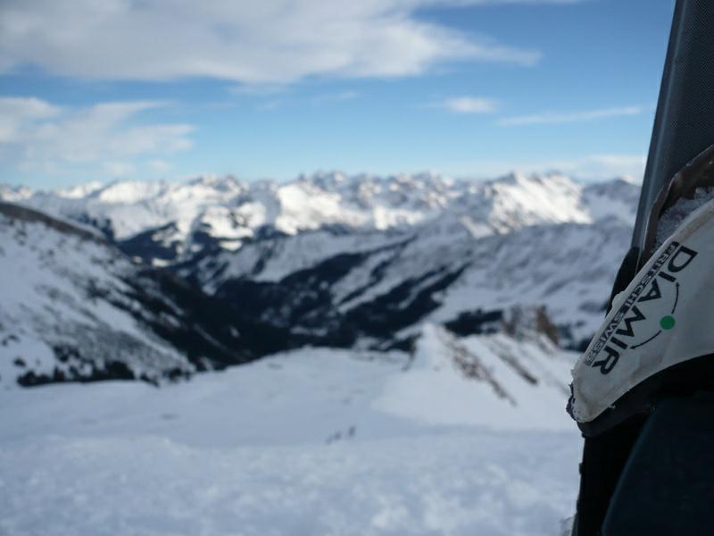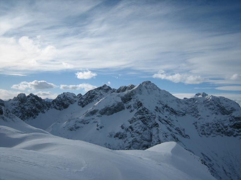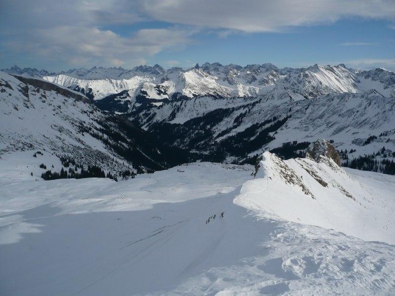 Heute griffen wir mit 13 Leuten das Karlstor an, gemeint ist die Scharte zwischen dem großen und dem kleinem Widderstein. Für den Aufstieg benötigten wir keine Harscheisen, trotzdem ist es empfehlenswert Harscheise mit zu nehmen. Wir erlebten windgepressten Pulver und Bruchharsch.