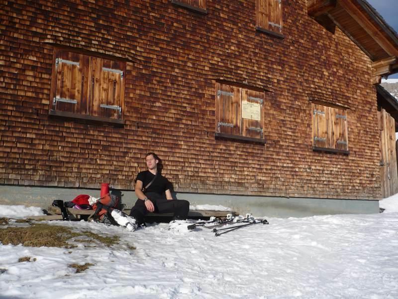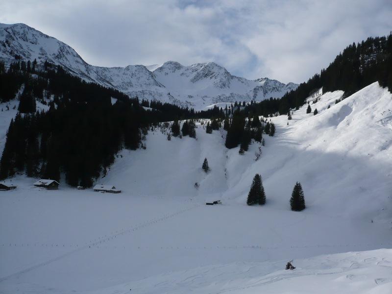 Abgefahren sind wir direkt vom „Schüsser“ über die Südhänge. Dabei haben wir uns leicht rechts gehalten zurück zur „Wannenalpe“, dort noch ein Pause eingelegt und die Sonne genossen. Weiter dann rechts weg abgefahren, aber nicht die Ausstiegs Spur folgend sondern den Hang weiter gequert. Der erste Teil ist ziemlich eng durch Steine und Latschen, aber dann kommt ein kleiner offener Hang, bevor es wieder eng wird. Zum Schluss heißt es noch die richtige Ausfahrt zu finden um noch ein paar schöne Schwünge zu machen. Wir haben die richtige erwischt und sind direkt an der „Innere Wiesalpe“ herausgekommen. Von dort Problemlos zurück zum Parkplatz.