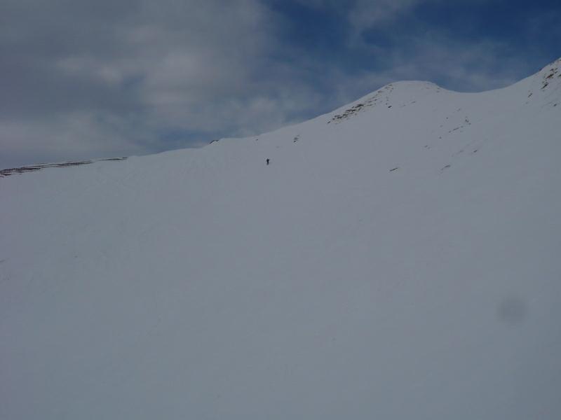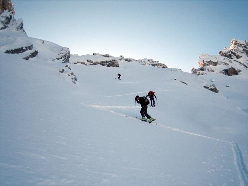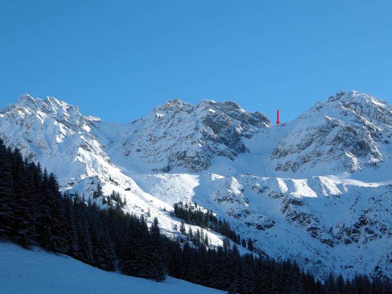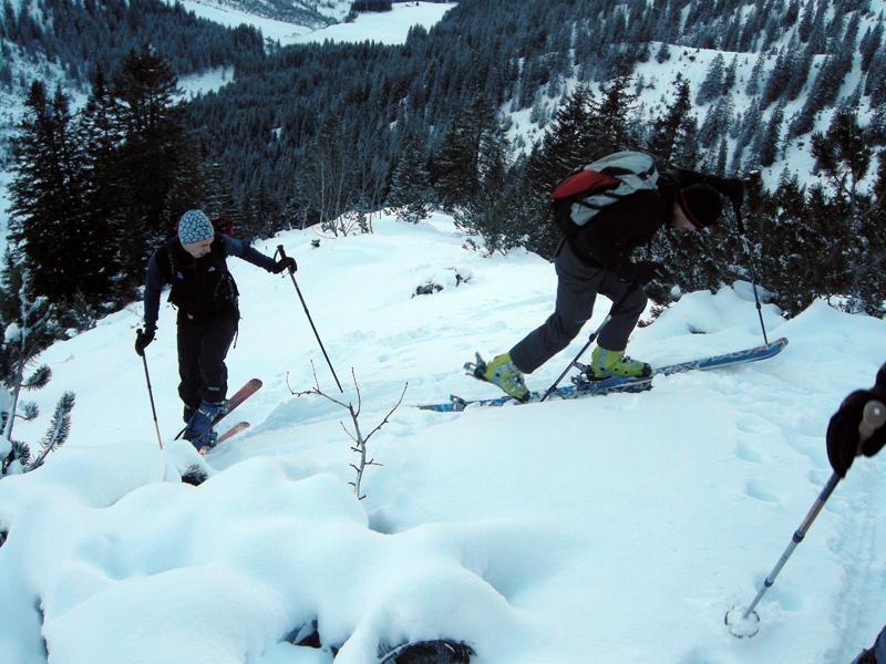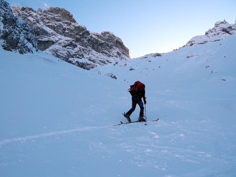 Im Panico-Führer wird der Aufstieg kurz nach der „Oberen Wiesalpe“ durch eine Rinne oder weiter rechts hoch beschrieben. Wir haben uns für diese Variante weiter Rechts entschieden, denn dort war schon eine Spur angelegt. Ich finde diese Variante auch die leichtere, denn die direkte Rinne kenne ich schon von einer vorherigen Skitour und diese wird teilweise recht steil durch die Latschen und Bäume.