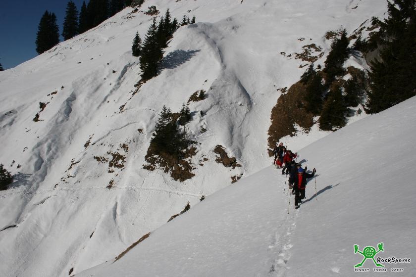 Schneeschuhtour zum Hahnenkamm - Norfri - 01.02.2009 Schneeschuhtour zum Hahnenkamm 1940 m Ausgangspunkt: Fährt man vom Oberjoch in Richtung Gaichtpass so befindet sich kurz hinter Nesselwängle auf der linken Seite ein kleiner Parkplatz 1440 m (sehr begrenzte Parkmöglichkeit). Höhenunterschied: 850 m Aufstieg: Vom Parkplatz geht es zunächst auf einem Fahrweg in Richtung Nesselwängle bis ein Hinweisschild den Weiterweg zur Schneetalalpe bzw. zum Hahnenkamm aufzeigt. So geht es auf breitem Fahrweg zunächst weiter bis man in den dichter werdenden Wald gelangt und auf schmaler und steiler werdender Spur schließlich diesen Waldgürtel überwindet. Man gelangt wieder in freies Gelände und nähert sich nun schnell der kritischsten Stelle der gesamten Tour, einem Tobel, der auf sehr steilen Hängen überquert wird. Danach taucht man wieder in Waldgelände ein und gelangt schon bald, wiederum auf schmalem Weg, zur Schneetalalpe 1650 m (im Winter nicht bewirtschaftet). Der Weiterweg zum nahen Tief Joch 1723 m ist einfach und ab hier verlässt man die Waldzone und erstmals wird der Blick frei auf die Ammergauer Berge sowie Wetterstein, Mieminger und Lechtaler Alpen. Der Gipfelanstieg ist einfach und bietet immer eine grandiose Aussicht. Vom Gipfel aus kann man die traumhafte Rundumsicht genießen und dem Treiben auf den tiefer gelegenen Skipisten zusehen. Abstieg: Wie Aufstieg Schwierigkeiten: Eine Tour, die dem erfahrenen und sicheren Schneeschuhtourengänger vorbehalten bleiben sollte. Knackpunkt der Tour ist zwar das Überqueren des Tobels aber es gilt daneben noch mehrere sehr steile Querungen sicher zu überwinden, die erhöhte Aufmerksamkeit erfordern. Nur mit Schneeschuhen zu begehen, die seitliches Abrutschen verhindern. Hinweis: Die Tour sollte nur bei sicheren Lawinenverhältnissen angegangen werden. Wer gute Verhältnisse vorfindet und die nötige Trittsicherheit auf Schneeschuhen mitbringt, der kann sich auf eine herrliche Tour freuen. Bitte unbedingt den aktuellen Lawinenlagebericht einholen und auch beachten. Blick auf Nesselwängle und die Krinnenspitze kurz nach dem Start am Parkplatz Auf breiter Fahrstraße geht es zunächst bergauf Aufstieg durch den Wald Blick auf die Lechtaler Alpen mit der Lailach (rechts) Immer wieder sind steile Hänge zu queren Beim Überqueren des Tobels Unsere Spur durch den Tobel Ankunft an der Schneetalalpe 1650 m Blick vom Tief Joch 1723 m auf die Lechaschauer Alpe und die Ammergauer Berge Blick vom Tief Joch 1723 m Richtung Hahnenkamm Aufstieg zum Gipfel des Hahnenkamm 1940 m Die letzten Meter zum Gipfel Gipfelrast am Sendemast Blick vom Gipfel ins Lechtal Blick zur Zugspitze Auf dem Rückweg Blick zum Gimpelhaus mit Roter Flüh und Gimpel (rechts) Zurück am Parkplatz |