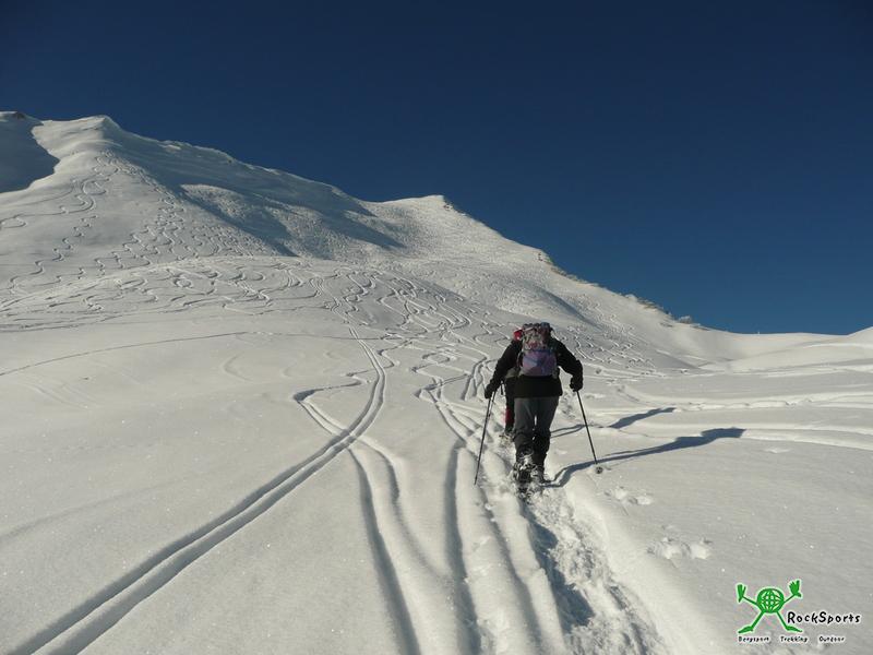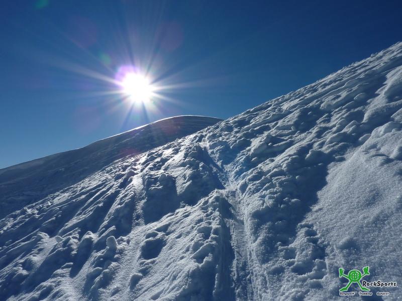 Schneeschuhtour zum Grünhorn 2039 m und den Ochsenhofer Köpfen von Baad - Norfri - 04.01.2011 Schneeschuhtour zum Grünhorn 2039 m und auf die Ochsenhofer Köpfe 1950 m von Baad am 03.01.2011 Ausgangspunkt: Parkplatz in Baad im Kleinwalsertal 1240 m Höhenunterschied: 975 m Aufstieg: Vom Parkplatz in Baad ging es bei -13°C auf der Straße durch Baad gleich steil bergauf ins Duratal (Hinweisschilder beachten). Nachdem wir den ersten steilen Anstieg bewältigt hatten querten wir zur Duraalpe 1386 m. Wir setzten die Querung noch fort bis es wieder steiler werdend durch den Wald in vielen kleinen Kehren Richtung Starzelalpe 1678 m hinauf ging. Kurz vor der Starzelalpe kamen wir aus der Waldzone heraus und der Blick auf ein wunderschönes Panorama wurde frei. Wenige Minuten später erreichten wir diese. Von hier stiegen wir weiter Richtung Grünhorn und in mehreren langen Kehren wurde der Gipfelhang angegangen und nur noch wenige Meter trennten uns vom Grünhorn 2039 m. Vom Gipfel genossen wir bei wolkenlosem Himmel das herrliche Gipfelpanorama, bevor wir zur Ochsenhofer Scharte 1850 m abstiegen. Hier legten wir eine Pause ein und stiegen dann über die Ochsenhofer Köpfe 1950 m weiter. Abstieg: Von der Scharte zwischen den Ochsenhofer Köpfen und dem Muttelbergkopf stiegen wir in Richtung Stierhofalpe 1678 m ab. Danach ging es wieder steiler werdend durch den Wald zurück, bis wir kurz vor der Duraalpe wieder auf die Anstiegsroute trafen, auf der es dann zurück zum Ausgangspunkt ging. Schwierigkeiten: Einige steile Passagen im Auf- und Abstieg in der Waldzone. Die Überschreitung der Ochsenhofer Köpfe erfordert sicheres Gehen mit Schneeschuhen. Besonderheiten: Eindrucksvolles Ambiente im hintersten Talkessel des Kleinwalsertals. Traumhafte Rundumsicht von den Gipfeln. Hinweis: Bei richtiger Routenwahl relativ sichere Tour. Trotzdem wie immer den Lawinenlagebericht einholen und auch beachten. Beim Überschreiten der Ochsenhofer Köpfe auf Wechten achten und genügend Abstand halten. Wir hatten traumhaftes Wetter bei -13°C beim Abmarsch und -12°C bei der Rückkehr. Es lag ausreichend Schnee und von herrlichem Pulverschnee bis Harsch war alles vorhanden. Ausgangspunkt Parkplatz in Baad 1240 m Unterwegs zur Duraalpe Duraalpe 1386 m mit Hochstarzel Aufstieg zur Starzelalpe Starzelalpe 1678 m mit Grünhorn (links) Widderstein mit Starzelalpe Anstieg zum Grünhorn 2039 m Im Gipfelhang des Grünhorns 2039 m Blick zum Widderstein Am Gipfel des Grünhorns 2039 m Ausblick vom Grünhorn auf die Allgäuer Alpen Ochsenhofer Scharte 1850 m mit Ochsenhofer Köpfen 1950 m Anstieg zu den Ochsenhofer Köpfen 1950 m Ochsenhofer Köpfe 1950 m und Muttelbergkopf Ochsenhofer Köpfe und Grünhorn Querung unter den Ochsenhofer Köpfen Stierhofalpe 1678 m Duraalpe 1386 m |