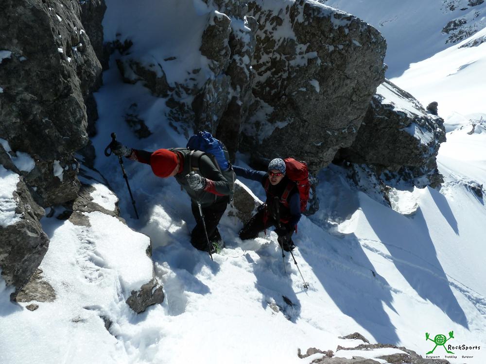 Alp- (2177m) und Rossgundkopf (2139 m) + Ostabfahrt ins Stillachtal / Allgäu 14.01.12 - Tobias - 17.01.2012 Endlich gute Verhältnisse...Juhuu...nach gefühlt wochenlangen Schneefällen und sehr hoher Lawinenstufe konnte man nun endlich etwas Skibergsteigen gehen und muss nicht nur auf den Voralpenmugeln rumrutschen. Zwei bestiegene Gipfel und eine völlig unverspurte 1250 Höhenmeter traumhafte Ostabfahrt hinab ins Stillachtal waren die Ergebnisse des Tages. Das folgende Bild wurde im Februar 08 aus dem Fellhorn-Skigebiet aufgenommen und zeigt den Aufstiegsweg in die Scharte zwischen Alpgundkopf und Roßgundkopf bei einer geringeren Schneedecke als wir sie derzeit befahren dürfen. Wir steigen zu Fuß von der Fellhorn-Talstation (910 m) an der Wank-Alm (1394 m) vorbei in den Warmatsgundkessel (ca.1450 m) und nutzen nicht die Bahnhilfe. Viele Freerider und viele Tourengeher sind dort hinten schon unterwegs. Mithilfe der Bergbahnen und einem ganz kurzen Aufstiege haben sie alle die Scharte südlich der Kanzelwand erreicht und von dort über traumhafte Osthänge den Warmatsgundkessel abfahrend erreicht. Die große Masse der Tourengeher steigt allerdings zum Fiderepass auf und lediglich zwei haben das gleiche Ziel wie wir, nämlich die Scharte zwischen Alpgundkopf (2177 m) und Roßgundkopf (2139 m). Die zwei Spuren aber unentwegt das unverspurte Kar ein und ließen sich nicht einholen. In vielen Spitzkehren geht es steil hinauf in die Scharte. Es herrschten beste Verhältnisse bei einer sehr gut gesetzten Schneedecke mit 20-30cm Pulverauflage. Unsere zwei Vorgänger machten sich bald wieder an die Abfahrt durch das Kar hinab in den Warmatsgundkessel. Wir spuren, wühlen und klettern nach links auf den Gipfel des Alpgundkopf (2177 m) und genießen die Blicke in einige der wilderen Allgäuer Winkel. Wieder zurück bei den Ski in der Scharte queren wir steil hinüber in die Ostflanke des Roßgundkopf. 6 Spitzkehren später haben wir eine kleine Mulde im SO-Grat des Roßgundkopf (2139 m) erreicht. Nun geht es weiter zu Fuß, die letzten Meter sehr steil, fast schon in Nordwandmanier, hinauf auf den engen Gipfel mit einem kleinen Steinmann. Ich bin dann direkt vom Gipfel abgefahren was weit weniger schwer war als zunächst erwartet. Danach folgte das absolute Highlight des Tages. Die traumhafte, völlig unverspurte !!! 1250 Höhenmeter Ostabfahrt hinab ins Stillachtal. Zunächst das eindrucksvolle Südostkar hinab in den Bereich der verfallenen Vorderen Tauferberg-Alp (1728 m) und nach links zur Senke des Guggersee (1709 m). Der Traum in weiß konnte beginnen....... Aus der Senke des Guggersee wenige Höhenmeter und ca. 250 Streckenmeter leider leicht aufsteigend zum Gugger P.1715 m. In Betracht der genialen Abfahrt ein kleiner Preis den es aufzuwenden gilt. Der Blick hinab ins Stillachtal wird langsam frei und es geht weiter vorbei am Scheidbichel (1511 m), einer Jagdhütte (1402 m)und durch schöne Waldschneisen ganz grob entlang des Sommerweges hinab. Lediglich ganz unten ist der Wald und das Buschwerk sehr eng und eine hohe Schneelage angenehm. Da wir aber derzeit durchaus von einer sehr hohen Schneelage sprechen können war es eher eine kurze Slalom-Einlage anstatt unangenehmer „Waldarbeit“ Ungefähr auf Höhe Birgsau (956 m) trifft man auf die Langlaufloipe entlang der Straße und kann zum Fellhorn-Parkplatz zurück Skaten. Skitourenführer: Skitourenführer Allgäu Panico 6.Auflage 2009 Kristian Rath Karten: AV-Karte 2/1 Allgäuer-Lechtaler Alpen West 1:25000 BLV-Karte UK L8 Allgäuer Alpen 1:50000 Viele Grüße Frank, Günter und Tobias |