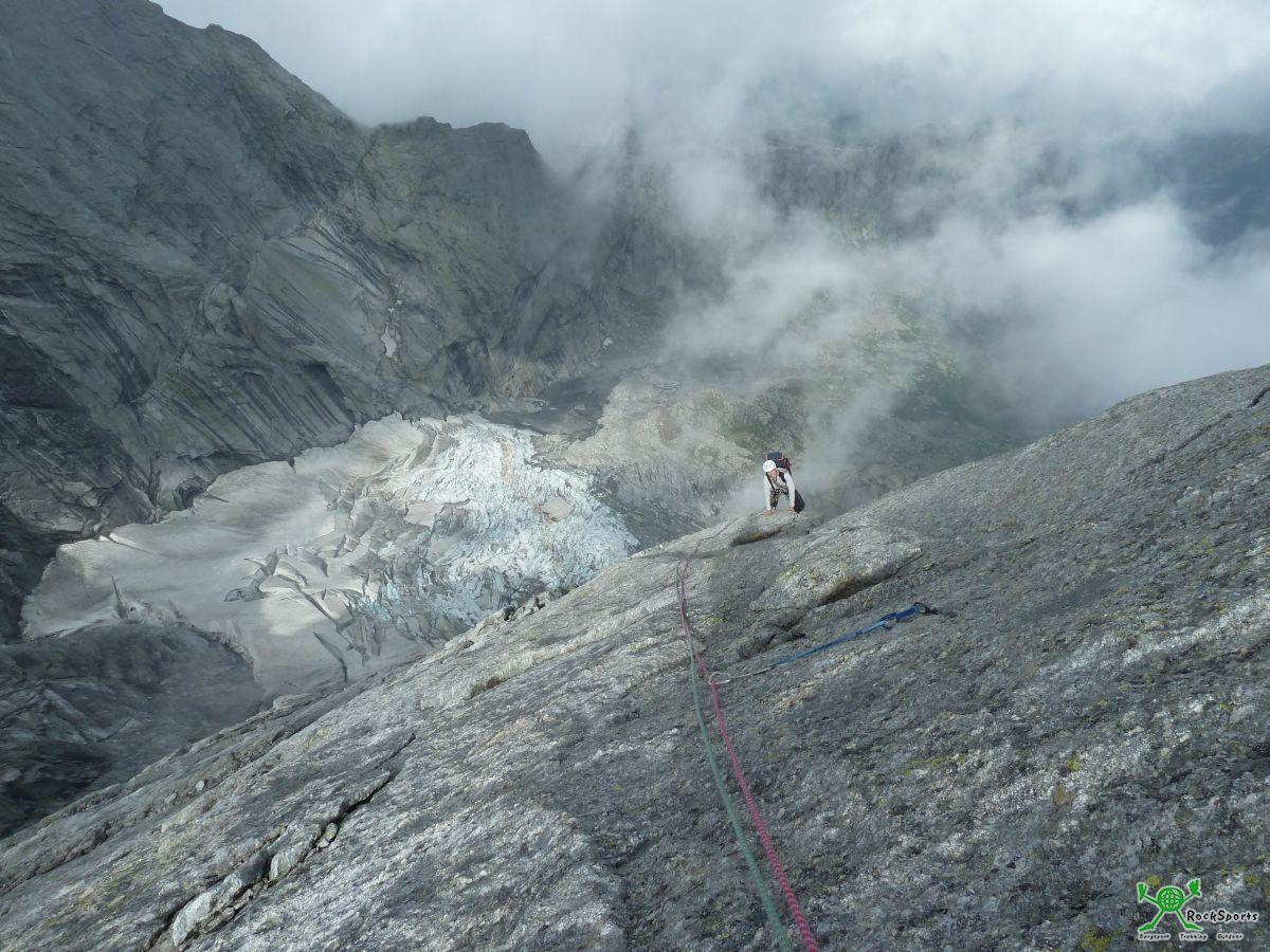 Piz Cengalo – NW-Pfeiler „Gaiser-Lehmann“ (V+, V+ obl., 1050 m), Bergell 24.08.12 - Tobias - 08.10.2012 „...da steht der Cengalopfeiler zwischen der Bügeleisenkante der Gmelli und der Nordkante des Piz Badile als dritte Granitschneide. Das Bild ist so abweisend wie anziehend. Niemand hat vor zwei Menschengenerationen an die Möglichkeit gedacht diese gewaltigen Urweltkeile zu ersteigen“ „Als die Badener Fred Gaiser und Berthel Lehmann den Pfeiler erstmals begingen, kämpften dicht gegenüber Ricardo Cassin und Kameraden um die große Badilewand – wobei zwei Italiener sterben mussten.“ aus: Walter Pause - im extremen Fels. Der Cengalopfeiler ist eine der ganz großen Klettertouren im Bergell, mit diversen alpinen Finessen. Der Alpine-Allrounder ist hier gefragt. Gletscher, Randkluft, nasser, sandiger und brüchiger Fels im unteren Teil, grandiose Kletterei am eigentlichen Pfeilerrücken und ein nicht endender Abstieg zurück auf die Nordseite gilt es zu bewältigen. Rein technisch zwar einen ganzen Grad leichter als die „Cassin“ in der Piz Badile Nordostwand , welche wir am Vortag geklettert sind, doch was den Gesamtanspruch anbelangt muss die „Gaiser-Lehmann“ als deutlich höher eingestuft werden. Da wir nach der „Cassin“ am Vortag über die Badile-Nordkante abgeseilt haben, und relativ zeitig wieder zurück auf der Sasc Furä Hütte waren konnten wir unsere Akkus wieder aufladen. Leider war die Wettervorhersage für den nächsten Tag noch schlechter als für den Cassin-Tag: Regenwahrscheinlichkeit schon am Vormittag. Nach einigen Überlegungen wollten wir die Sache aber trotzdem angehen und einfach versuchen so früh wie möglich auf dem Gipfel des Cengalo zu sein, um wenn möglich nicht auf dem Pfeiler nass zu werden. Insgesamt hatten wir ein gutes Gefühl was die Verhältnisse am Pfeiler und die Steinschlag-Verhältnisse im ersten Teil anbelangt. Während der „Cassin“ hatten wir ja die Möglichkeit die ganze Sache zu beobachten und es war nahezu den ganzen Tag alles ruhig drüben im Bereich des Cengalo NW-Pfeilers. Also wird es wohl einen Tag später auch nicht viel schlechter sein. Außerdem sah der Gletscherzustieg auch nicht ganz unmöglich aus, auch wenn sie auf der Hütte meinten es ginge wohl nicht mehr. Etwas anders sah es natürlich auf der Cengalo NO-Seite aus. Der riesige, nicht nur durch die Alpinpresse gegangene, Bergsturz am Cengalo zum Jahreswechsel 2011/2012 welcher nahezu das ganze hinterste Bondascatal verwüstet hat und die wohl Touren in diesem Bereich zerstört hat ist erstens deutlich zu sehen und zweitens sind seine Folgen in Form von nachfolgendem Steinschlag ständig zu hören. Nicht nur der Weg zwischen Sasc Furä und Sciora Hütte ist derzeit offiziell gesperrt auch von einer Begehung der Bügeleisenkante wurde dringenst abgeraten, wegen erheblicher Steinschlaggefahr im Einsteigsbereich. Anscheinend wird überlegt den Einstieg dieser häufig begangenen Tour zu verlegen. Wie schon am Vortag hat es in der Nacht wieder massiv geregnet. Gegen 04:30 marschieren wir los, Über das Viäl geht es zu den Resten des Cengalogletscher, welchen wir gegen 06:00 Uhr noch im stockfinsteren erreichen. Das Wetter zeigte sich auch noch eher beleidigt und schickte schon am frühen morgen kleine Gewitterzellen mit etwas Donner und Blitz. Zum Glück ist aber alles schön nach Westen in Richtung Sciora-Hütte abgezogen. Der Gletscher war natürlich um diese Jahreszeit (Ende August) schon deutlich zerrissen und der Weg bestand aus einigem Auf und Ab. Das eigentliche Problem sollte aber die Randkluft sein. Nahezu auf der ganzen zum losklettern in Frage kommenden Wandbreite, klaffte eine gewaltige Kluft von 20-30 m tiefe und 10 m breite zwischen Gletscher und Fels. So wäre es nahezu unmöglich gewesen, die angenehmen Startpunkte drüben am Fels zu erreichen. Die alleinige Möglichkeit ohne Abseilaktionen rüber zu kommen Bestand aus einer einzigen kleinen, etwas fragwürdigen Schneebrücke etwas weiter oben Richtung Couloir. Soweit so gut, dies hatte aber den kleinen Nachteil, auf der Schneebrücke stehend das Schuhwerk wechseln und gleich im obersten V. Grad, über nasse Platte etwas heikel wegklettern zu müssen. Eine andere Möglichkeit gab es aber eben nicht. Kurz vor 07:00 Uhr klettern wir los. Dem Ruf von unangenehmem Gelände im unteren Teil wird der Cengalopfeiler leider total gerecht. Über sandige, brüchige, moosige, grasdurchsetzte und in unserem Falle noch total nasse Felspassagen geht es zunächst eher planlos empor. So recht zuordnen zu einer Beschreibung oder dem Topoguide-Topo können wir das Gelände noch nicht. Wir müssen zunächst dem Gefühl folgen. Nach einigen Rampen folgt der Teil mit nahezu Gehgelände (120 m II-III) und dem „brüchigen Aufschwung“. Von da an sollte die Routenfindung mit etwas Gefühl und Erfahrung in solchem Gelände keine Probleme mehr darstellen. Alle weiteren Angaben zu den Seillängen beziehen sich auf das gute Topoguide Topo: Nun können wir auch endlich etwas Tempo aufnehmen und am langen Seil klettern. Denn das Wetter hatte sich zwar, nach einigen Regentropfen in den ersten Seillängen, etwas gebessert, doch so ganz koscher war es noch langer nicht. Florian rennt durch die Seillängen 5-7 bis auf die markante große geneigte Platte. Vom Stand auf der markanten großen geneigten Platte unbedingt nach links um die Kante in die folgende steile und anstrengende Verschneidung klettern. Es lief nun sehr gut und die Seillängen am langen Seil ließen sich zügig abspulen. Die Schwierigkeiten sind nie anhaltend und Kletterei ist richtig toll: Irgendwann haben wir nicht mehr versucht das Topo genau zu verfolgen, denn es gibt am markanten plattigen Pfeilerrücken des Cengalopfeiler mehrere Möglichkeiten mit wahrscheinlich ähnlichen Schwierigkeiten. Wenn Nebel und Wolken es zu ließen gab es beeindruckende Blicke in die Piz Badile NO-Wand. Nach gut 5 h 45 min Kletterzeit haben wir kurz vor 13:00 Uhr das le