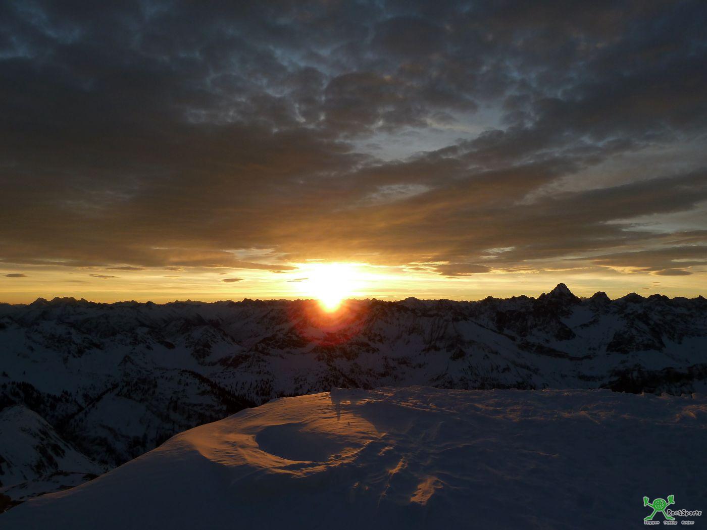 Gr. Daumen Silvesternacht (2280 m) 2012-2013 / Allgäu - Tobias - 04.01.2013 Nachdem Nina und ich mit dem Rubihorn und dem Hohen Ifen schon zweimal Silvester auf einem Gipfel verbracht hatten stand für diese Silvesternacht 2012 / 2013 wieder einer der bekannteren Allgäuer-Gipfel mit grandioser Aussicht auf dem Programm: Der Große Daumen (2280 m). Er ist bekannt für seine Aussicht von der Zugspitze im Osten, über den gesamten Allgäuer Hauptkamm bis zum Säntis im Westen. Insbesondere in der Silvesternacht ist natürlich auch die tolle Aussicht auf die Städte Sonthofen, Immenstadt, Kempten und das ganze Alpenvorland beeindruckend. Aufgrund der sternenklaren Vollmondnacht waren um 24 Uhr selbst die Raketen und Lichter von Memmingen und Kaufbeuren klar auszumachen. Einfach herrlich, jedesmal wieder... Am Nachmittag des 31. fahren wir erst gegen 15:00 Uhr mit der Nebelhornbahn bis zur Gipfelstation. Nach einem kurzen Besuch beim Gipfelkreuz und dem obligatorischen, doch immer wieder beindruckenden, Blick hinunter in die Nordwand konnte es losgehen. Sofort kamen die Erinnerungen auf an die Skibefahrung der Nebelhorn-Nordwand letzten Winter zusammen mit Alban. Gegen 15:30 verlassen wir das Skigebiet und queren über das Koblat nach Nordosten. Als Koblat wird das flache Hochplateau unterhalb des Hindelanger Klettersteig bezeichnet. Zunächst kann man noch bis etwas nach dem Östlichen Wengenkopf mit Ski abfahren. Danach gilt es die Felle aufzuziehen. Über den Koblat- und Laufbichlsee wird der steilere Gipfelaufschwung des Großen Daumen erreicht. Eine herrliche Abendstimmung begleitete uns bei diesem Aufstieg. Mit dem letzten Tageslicht haben wir dann gegen 17:00 Uhr den Gipfel des Großen Daumen (2280 m) erreicht und 3 m neben dem Gipfelkreuz das Zelt aufgeschlagen. Um 24 Uhr war es noch immer eine sternenklare Vollmondnacht und das große Feuerwerksspektakel war bestens zu sehen und auch zu hören. Wie schon eingangs erwähnt liegen einem die Städte Sonthofen und Immenstadt quasi zu Füßen. Auch die Größe von Kempten konnte aufgrund der erhöhten Helligkeit bestens ausgemacht werden. Am Horizont waren dann noch Kaufbeuren uns sogar Memmingen als enorme Ansammlungen von Helligkeit auszumachen. Dass die Deutschen wieder wie jedes Jahr in einigen Minuten weit über 100 Millionen € (!!!) in den Himmel schießen kann man sich beim Blick von oben nur allzu gut vorstellen. Auch in der Allgäuer Bergwelt war manches Licht zu erkennen. Geschossen wurde auf dem Prinz-Luitpold-Haus, dem Fellhorn Skigebiet und vermutlich auf dem Toreck im Kleinwalsertal. Danach ging es wieder in die dicken Daunenschlafsäcke. Am nächsten Morgen gab es einen wunderschönen Sonnenaufgang über der Allgäuer Bergwelt wie ich es auch noch selten erlebt habe. Nun ist ja so ein Sonnenaufgang nach sternenklarer Nacht immer etwas Besonderes und schönes. Die besondere Würze dieses Sonnenaufgangs war aber noch die leichte Schichtbewölkung. Das ganze in Kombination mit der Aussicht vom Gipfel, dass hatte schon was Umwerfendes an sich... Nach ausgiebigem fünfsterne Frühstück ![]() gehen wir wieder zurück übers Koblat ins Nebelhorn-Skigebiet und über die Piste nach Oberstdorf. Erneut ein wunderschönes Erlebnis. Skitourenführer: Skitourenführer Allgäu Panico 6.Auflage 2009 Kristian Rath Karte: BLV-Karte UK L8 Allgäuer Alpen 1:50000 Viele Grüße Nina und Tobias |
