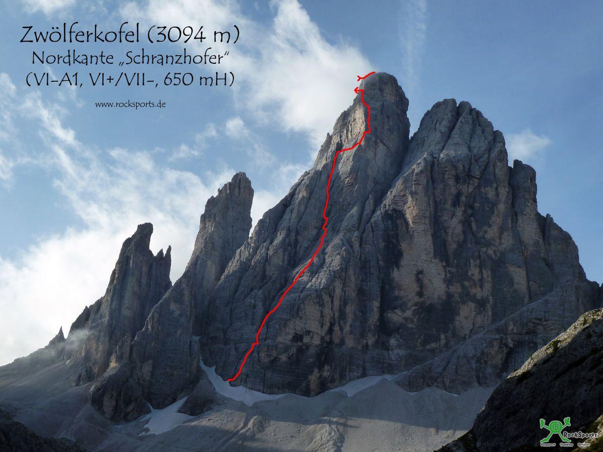 Zwölferkofel - Nordkante "Schranzhofer" (VI-A1, VI+/VII-, 650 mH), Dolomiten 07.09.13 - Tobias - 22.09.2013 „Eine große, ernste Kletterfahrt ausgesprochen hochalpinen Ranges, mit sehr viel Freikletterei. … Diese Nordkante bietet Freikletterei im klassischen Stil, gehört aber sicher zu den großartigsten Felsfahrten der Sextener Dolomiten.“ „Die jungenSextener Führer Schranzhofer hatten schon im September 1931 einen Durchstieg versucht und nach einem Biwak abgebrochen. Am 30. Juli 1932 kamen sie dann durch, bezwangen den lotrechten obersten Pfeiler. Vier Stunden nach ihnen kamen Hans Steger und Paula Wiesinger auf den Gipfel: als Geschlagene?“ aus: Walter Pause – im extremen Fels. „Die Nordkante wurde 1932 Schauplatz eines Wettlaufs, in dem allerlei Unfeinheiten zur Anwendung kamen: Die Brüder Franz und Toni Schranzhofer, die schon 1931 einmal in der Wand waren kriegten Wind von dem Plan Hans Stegers und Paula Wiesingers, ihnen das Problem wegzuschnappen. Rasch wurden Ersatzführer für die Touristen ausgeguckt, in einem nächtlichen Abstieg nach Sexten Material geholt und dann zur Zwölfer-Nordwand aufgestiegen – nicht ohne nebenbei dem Hüttenwirt noch vorzuschlagen, die Seilschaft Steger-Wiesinger ruhig ein Stündchen später zu wecken. Als die beiden im ersten Morgenlicht zur Wand kamen, waren die Schranzhofer schon weit oben und sicherten sich ihren Vorsprung durch Herausschlagen aller Haken, so daß die sieggewohnten Zugereisten erst einige Stunden nach ihnen am Gipfel ankamen.“ aus: Richard Goedeke – AV-Führer Sextener Dolomiten Noch einmal für diesen Sommer sollten Wetter und Verhältnisse eine der größeren nordseitigen hochalpinen Klettereienan einem hohen Dolomitengipfel zulassen. Zusammen mit Nina geht es dieses mal in die Sextener Dolomiten und mit der Zwölferkofel Nordkante „Schranzhofer“ an einen der großen Sextener-Alpinklassiker hoch über dem Fischleinboden. Wenn man so in der Literatur über diese Nordkante der Gebrüder Schranzhofer aus dem Jahre 1932 am Zwölferkofel (auf italienisch Croda dei Toni) zu recherchieren beginnt kann man schnell den Eindruck gewinnen, dass es sich um eine echt tolle Tour in größtenteils festem Fels bei gemäßigten Schwierigkeiten handelt. Unisono ist sowohl im Pausebuch, im alten Goedeke AV-Führer sowie im Loboedition von sehr gutem lediglich in den ersten beiden Längen der großen Kaminreihe brüchigen Gesteins die Rede. Doch zwei Tatsachen ließen diese Aussagen schon im Vorfeld etwas zweifelhaft erscheinen. Es gibt da bei gipfeltreffen.at einen Eintrag der eher dramatisch tönt . Nun gut, wenn man aber nicht genau weiß wer das geschrieben hat und wie die drauf sind bin ich bei solchen Internet Berichten immer Vorsichtig. Erst im Nachhinein hab ich noch herausgefunden, dass dies aber äußerst erfahrene und den Pausetouren alles andere als abgeneigt gegenüberstehende Alpinisten waren. Vor allem aber wunderte mich die Aussage meines guten Bekannten Franz Baumann, dass er die Tour, welche er irgendwann in den 1960er Jahren gemacht hat, in eher unguter Erinnerung hat. Er, der bekannten „Karwendel-Franz“, welcher an die 95 Pausetouren im Tourenbuch stehen hat, viele große Erstbegehungen im Karwendel gemacht hat und mit brüchigem Fels definitiv umzugehen weiß. Nun gibt es bei solch konträren Vorzeichen einer Tour zwei Möglichkeiten, entweder verzichten oder selber eine Meinung bilden. Da ich lieber zweiteres bevorzugte sind wir losgezogen. Hier mein Eindruck: Die Aussage „Weihwasser und Schutzengel für die künftigen Begeher“ des schon erwähnten Internetberichtes ist vielleicht etwas übertrieben aber in der großen Kaminreihe kann man schon an manchen Stellen durchaus das Fürchten lernen! In den zwei Schlüsselseillängen und der Seillänge nach dem Quergang, hoch oben an der Pfeilerkante, sehr guter griffiger und fester Fels. Ansonsten eher unterdurchschnittlicher, aber auch nicht ganz schlimmer, Dolomitenfels, in der 250 m langen großen Kaminreihe schlechter bis richtig schlechter Fels, diverser Bruchkategorien. Alles in allem kann diese ernste Abenteuer-Tour nur in diesem Gelände äußerst erfahrenen Alpinkletterern und eingefleischten Pause-Sammlern empfohlen werden, alle anderen lassen es lieber bleiben und machen andere Touren. Auf der einen Seite hat sich dieser Eindruck bei mir vielleicht noch verstärkt, da ich alle Seillängen vorgestiegen bin, auf der anderen Seite bin ich diesen Sommer schon so einiges an Bruch- und Abenteuergelände geklettert und gewöhnt. Trotz alledem ist diese Tour natürlich unter alpinistischen Gesichtspunkten etwas Besonderes und zudem äußerst selten wiederholt. Laut dem lokal bekannten Bergführer und Hüttenwirt Klaus Happacher war dies die erste Begehung in diesem Jahr und bei in den letzten Jahren maximal einer Begehung pro Jahr vermutlich auch die letzte. Die Erstbegehungsgeschichte (siehe Zitate), die tolle klassische Linie durch diese wilde abweisende Wand und nicht zu Letzt der Berg selbst trägt zur Besonderheit bei. Denn seien wir mal ehrlich, von der Zsigmondy-Comici-Hütte aus betrachtet ist dieser Zwölferkofel schon ein Bild von einem Berg!!! Tourenbericht: Am Freitagnachmittag nach der Arbeit fahren Nina und ich nach Sexten und weiter bis zum großen Parkplatz im Fischleintal. In knapp 1h 45 min geht es am Abend zur bestens geführten Zsigmondy-Comici-Hütte (2224 m) und gerade noch rechtzeitig bevor die Küche schließt (20:00 Uhr) trudeln wir ein. Am nächsten Morgen starten wir gegen 05:45 Uhr hinaus in die sternenklare Nacht. Nach ca. 30 min steht man am Schneefeld vor dem Einstieg. Der Übergang vom Schneefeld auf den Fels stellte sich bei uns nicht ganz unproblematisch dar und kann je nach Verhältnissen sicher auch noch größere Probleme darstellen. Das bockharte Schneefeld war nur mit Zustiegsschuhen und spitzen Steinen in der Hand auch nicht ganz trivial. Die klaffende große Randkluft umgingen wir, indem wir etwas recht