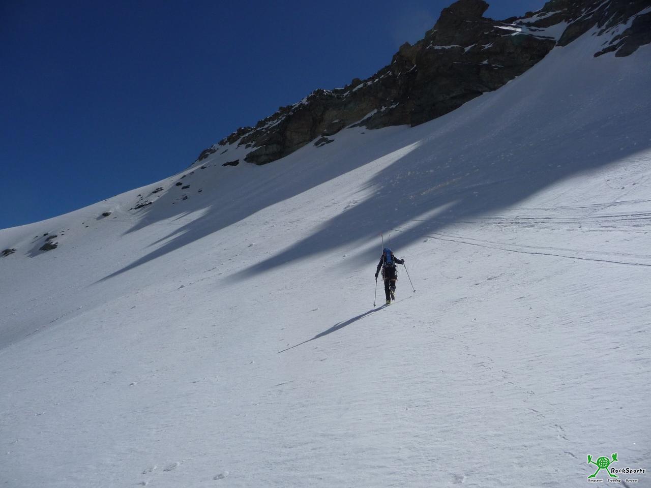 Spinaspfeiler, Piz Palü Westgipfel Nordwand, 25.05.14 - Alban - 28.05.2014 Der Piz Palü übt mit seiner imposanten Nordansicht starke Anziehungskraft sowohl auf Skihochtourenaspiranten als auch auf Fels- und Eiskletterer aus. Die Dimensionen dieses Berges als auch seines Nachbarn dem Piz Bernina haben eigentlich schon Westalpenformat. Die leichte Erreichbarkeit des Gebietes durch die Diavolezza-Bahn steigern zusätzlich nochmal die Beliebtheit der dortigen Hochtouren. Die breite Nordwand des Piz Palü wird durch 3 markante Pfeiler gegliedert und den jeweils seitlich bzw. dazwischen gelegenen Eiswänden die teils mächtige und bedrohliche Seracformationen aufweisen. Aufgrund der drohenden Gefahr der Seracs und den weitaus objektiv sichereren Pfeilerrouten werden die „Eiswände“ zwischen den Pfeilern wohl nur sehr selten geklettert. Das beliebteste Ziel ist der Ostpfeiler (Kuffner), der hauptsächlich Felskletterei bis ca. UIAA 4 (Einzelstellen bis 5 auf gängigen Varianten) bietet und einen sehr moderaten und eher flachen Firngrat zum Schluss aufweist. Die Gipfelwächte, wie sie noch in altem Führerwerk steht, existiert kaum mehr bzw. sofern in kleinerer Ausprägung vorhanden kann diese rechts (westlich) zumeist einfach umgangen werden. Der Mittlere Pfeiler, der berühmte „Bumiller-Pfeiler“, ist der schwerste der 3 Pfeiler. Hier wartet Fels bis zum oberen 5 Grad und je nach den Eisverhältnissen Eis/Firn zw. 50-75 Grad. Durch das Wegschmelzen und Wegbrechen der Eisnase direkt oberhalb des felsigen Mittelparts dürften die aktuellen Anforderungen im Eis leichter sein wie in früheren Jahrzehnten. Zudem kann diese Eisnase auch links in deutlich leichterem Gelände umgangen werden. Was bleibt ist die objektive Gefahr die von dem riesigen Seracbalkon westlich des Bumillerpfeilers ausgeht und die den Zustieg zum felsigen Mittelpart bedroht. Der westliche Pfeiler, der Spinaspfeiler ( Via Zippert) ist der vermutlich am seltensten besuchte Pfeiler. Evtl. deswegen weil die anderen Pfeiler besser bekannt (mehr Infos verfügbar) oder eben beliebter sind. Manches mag natürlich auch die nicht ganz zutreffende Schwierigkeitsbewertung im SAC-Führer (Fels bis 5-) beigetragen haben. Nachdem sowohl Peter als auch ich die beiden anderen Pfeiler (Ostpfeiler und Bumillerpfeiler) in vergangenen Jahren schon geklettert sind rückte der Spinaspfeiler immer weiter nach oben auf der Liste möglicher Tourenziele im Engadin. Durch die doch eher niedrigen Felsschwierigkeiten und Eislastigkeit des Pfeilers planten wir die Ski auch mit durch den Pfeiler zu nehmen um einen angenehmeren und schöneren Abstieg als auch Zustieg zu haben. Am Samstag fuhren wir bei bestem Wetter ins Engadin und konnten vom Berninapaß aus bereits den Pfeiler voll einsehen. Es hatte noch relativ viel Schnee im Gebiet und der Spinaspfeiler schien gute Verhältnisse zu haben. Wir hatten uns entschlossen oben auf der Diavolezza zu übernachten. Zwar wäre die Tour auch als ambitionierte Tagestour vom Tal aus möglich, von einer so durchgeführten Begehung des Bumillerpfeilers wusste ich aber noch wie strapaziös dann das Gesamtunternehmen werden kann und schließlich machen wir das Alles ja zum Spaß. Um nicht gleich zu sehr der Dekadenz zu verfallen liefen wir wenigstens mit Tourenski die Piste zu Diavolezza-Bergstation hinauf. Kurz vor 16 Uhr hätte es nämlich auch noch zu einer Bergfahrt mit der Bahn gereicht. Nach etwa 2h 15min waren wir nach gemütlichem Aufstieg auf der noch offenen Skipiste an der Bergstation angekommen. Gerade rechtzeitig zum Abendessen. Von Walöters-Tourenbericht zum Spinaspfeiler ( http://wuidebuam.blogspot.de/2011/05/piz-palu-spinaspfeiler-westpfeiler.html ) wusste ich bereits wie exklusiv die Küche dort oben sein soll. Unser 4-Gang-Halbpensions-Menü war dann wirklich zum Genießen und hatte so gar nichts mit z.B. dem Instant-Essen auf italienischen Hütten gemein. Von unserem Sitzplatz aus gab´s noch gratis großes Kino mit Blick auf die Nordwände des Palü, Bernina und Morteratsch, a Bier dazu: harte Bergsteigerentbehrung sieht anders aus. Mit einem Fernglas betrachteten wir unser morgiges Tourenziel im Detail und spähten den besten Weg aus. Nahezu geplättet von dem opulenten Mahl bezogen wir dann relativ früh unser Lager denn ab 3.15 Uhr gab´s ja schon wieder das Frühstücksbüffet. Dieses stand dem Abendessen in seiner Üppigkeit und Qualität (Bircher-Müsli, Cappuccino, lecker Brot, Obst….) in nichts nach. Kurz vor 4 zogen wir dann die Ski an und starteten unsere Tour. Über Nacht hatte es abgestrahlt und die Schneedecke war gut gefroren. Ohne Felskontakt ging es zuerst steil die 250Hm hinunter auf den Pers-Gletscher und dann auf einer schon vorhandenen Spur Richtung Bumillerpfeiler. Der Gletscher war super eingeschneit und selbst auf dem Normalweg wies die Spur nur wenige sichtbare Spalten auf. Mit dem ersten Licht kamen wir unterm dem Bumillerpfeiler an. Erinnerungen an die frühere Begehung dieser tollen Linie kam auf. Wir querten zügig rüber zum Einstieg des Spinaspfeiler und rödelten auf. Nachdem Steigeisen, Eisgeräte, Seil und sonstige Hardware aus dem Rucksack draußen waren kamen die Ski und Stöcke wieder ran, in der Summe dadurch der Rucksack kaum schwerer. Perfekt. Um 5:30 Uhr stiegen wir ein. Der Bergschrund war einfach zu überwinden und in gutem Trittschnee stapften wir seilfrei die markante Rinne hinauf. Anfangs teils nur 45 Grad steil kamen zum Ende hin Passagen bis 50 Grad. Die Sonne berührte bald die gesamte Wand und zauberte eine herrliche Atmosphäre. Ich war einfach nur dankbar unterwegs sein zu dürfen und genoss das zügige Vorankommen und alpine Ambiente. Am Ende wurde die Rinne immer schmaler. Wir stiegen bis ganz zum Ende und querten dann weiter ansteigend in leichtem Mixedgelände nach links bis wir einen ersten steilen Felsturm somit etwas links umgangen hatten. Unter uns fiel die Wand nun steil ab und zunehmend scharten wir mit den Steigeisen und Eisger