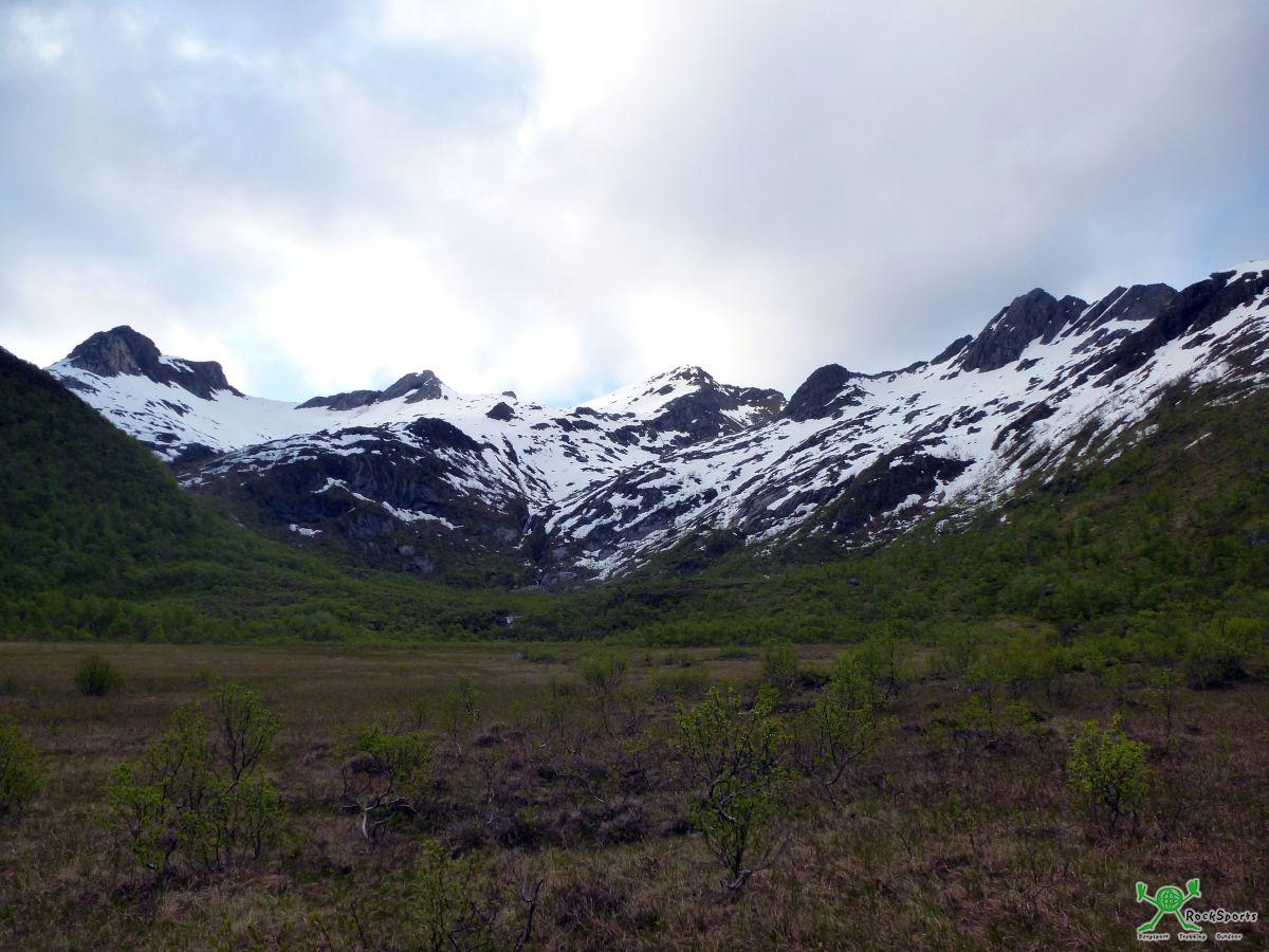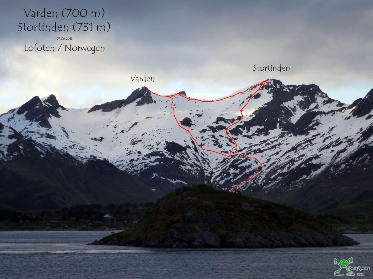 Varden (700m), Stortinden (731m) / Lofoten, Norwegen 07.06.15 - Tobias - 02.07.2015 Nach drei tollen Tagen auf der Insel Senja ging es weiter über die Vesteralen auf die Lofoten. Auf den Lofoten verbrachten wir sechs wunderschöne Tage. Neben mehreren Klettertagen ging sich bei mir auch noch eine kurze Frühjahrsskitour aus. Nach bewährtem Muster starte ich sehr früh am Morgen, bin zum Frühstück wieder zurück am Wohnwagen um in diesem Fall gleich weiter ins Sportklettergebiet Finvika (Bericht folgt) zu können. Insbesondere der Varden (700m) ist ein großer Skitourenklassiker auf den Lofoten und wird im Winter sehr häufig bestiegen. Er lässt sich über ideales Skigelände sowohl von Westen vom Olderfjord wie auch von Osten von Kabelvag aus besteigen. Der Stortinden ist doch etwas steiler und der Aufstieg durch die Nordflanke oft lawinengefährdet und sein NO Grat ist vermutlich häufig stark überwechtet. Im Frühjahr war dies nun kein Problem mehr. Die Schlüsselstelle des Tages erfolgte jedoch völlig unerwartet bereits im Zustieg noch mit dem Ski am Rucksack. Was norwegische Feuchtwiesen bedeuten können hatte ich komplett unterschätzt! Wer das folgende Bild sieht wird sich denken: Easy, bequeme Wiese und dann leichter Wald bis zum Beginn der Schneefelder. Doch diese völlig unscheinbare „Wiese“ entpuppte sich als Handfestes Feuchtgebiet. Das vorwärtskommen zeigte sich also nicht so einfach, will man hier nicht als Moorleiche enden. Mein erster Ansatz war, den physikalischen Gesetzten folgend, das Laufen auf den minimal höhergelegenen Bereichen. Doch wie sich rausstellte brachte das keinerlei Vorteil und das viele Wasser scheint hier anderen Gesetzen zu folgen, oder diese Böden habe eine enorm größere Wasserspeicherkapazität im Vergleich zu den von uns gewohnten Erdschichten. So bleib nur vorsichtiges vorwärtstasten, um die tiefsten Stellen zu umgehen. So kam ich mir etwas vor wie auf einem Gletscher wenn man mit den Stöcken nach Spalten sondiert. Endlich wieder auf dem Schnee lief es dann wie am Schnürchen und über perfekten tragenden Frühjahrsfirn ging es höher. Zunächst in den Sattel zwischen Varden und seinem rechterhand liegenden kleinen Nebengipfel. Zunächst ging ich nach links auf den Hauptgipfel und wenig später noch auf den kleinen Nebengipfel. Nach dem Varden Nebengipfel geht es weiter zum Stortinden. Zunächst etwas bergab und dann direkt durch die Nordflanke zum Gipfel. Auch von dort traumhaftes Lofoten Panorama. Wie schon beim Aufstieg musste ich das Feuchtgebiet natürlich auch bei Rückweg wieder durchqueren. Doch nun wusste ich ja immerhin schon dass es geht und wo es geht. So navigiere ich gezielt um die moorigsten Stellen herum. Auch bin ich nicht mehr ganz so erschrocken wenn die Fußsohle beim Belasten plötzlich mal wieder 15 cm im Moorwasser verschwindet. Nach dieser vermutlich letzten Skitour der Wintersaison 14/15 waren wir am Nachmittag noch im tollen Sportklettergebiet Finvika. Traumhafter Granit und zur Abwechslung sogar mal Bohrhaken. Bericht folgt… Führer / Beschreibungen zu Skitouren in Norwegen und auf den Lofoten Toppturer I Norge 3. Auflage 2011 FRIFLYT Lofoten - Skiing in the Magic Islands 1. Auflage 2013 Nord Norsk Klatreskole Jonas Dahlstrup, Thorbjorn Enevold Karten: 1:100 000: Turkart Lofoten / Nr.2549 1:50 000: Turkart Vagan / Nr.2671 Viele Grüße Tobias |