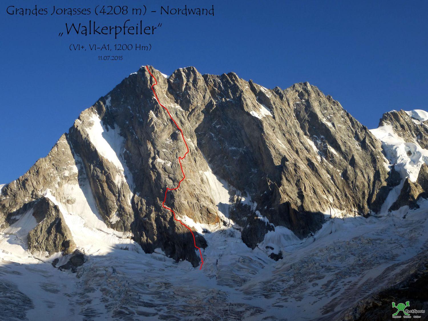 Walkerpfeiler - Grandes Jorasses Nordwand (VI+ / VI- A1 / 1200 mH) 11.07.15 - Tobias - 14.07.2015 „Kein Zweifel mehr: Der Walkerpfeiler ist auch heute noch das begehrteste Ziel für alle Bergsteiger unter den Extremkletterern. … . Hier ist ein wahrer Pfeiler aus Urgestein, der als kolossale Säule auf breiter Basis aus den Eisdecken des Leschauxgletschers bricht, um in eindeutig gerader Linie, nach oben immer schlanker werdend, zum höchsten Punkt der schwarzen Riesenmauer aufzusteigen. Welch ein Bild!“ „Wie sonst keiner in den Alpen wirkt der gewaltige Pfeiler bestürzend und begeistern hoch, mächtig, drohend – unmittelbar über seinen Rücken drängt eine klare Führe ohne Umwege zur Gipfelwächte. Es ist die große, die klassische Granit-Eis-Führe…“ aus: Walter Pause - im extremen Fels. „unvergleichbare Einsamkeit, düsteres, jede Form von Leben abweisendes Gelände aus Fels und Eis, das einen erschüttert. Lediglich unser Handlungsdrang und das Feuer unserer Jugend sind stärker als das Abschreckende einer solch öden und von der Sonne fast gänzlich unberührten Gegend“ aus: Riccardo Cassin – Erster am Seil. „Ich spreche aus Erfahrung, wenn ich behaupte, daß die Bezwingung der Nordwand der Grandes Jorasses über den Nordpfeiler der Pointe Walker die Erfüllung eines der schönsten Bergsteigerträume ist. Aber wenn das Erlebnis dem Traum ebenbürtig sein soll, so muss der Bergsteiger auch hier anspruchsvoll bleiben gegen sich selbst!“ aus: Gaston Rébuffat. 100 Idealtouren im Montblanc-Massiv Grandes Jorasses – Nordwand „Walkerpfeiler“!!! Der Nimbus und Ruhm dieser Tour ist wohl nicht zu überbieten und reicht weit über die Grenzen der Alpen hinaus. Ein Grandes Courses der absoluten Extraklasse, ein Highlight im Tourenbuch und zudem einer der ganz großen Pausepunkte. Zusammen mit Jürgen, Florian und Paul starte ich in das Abenteuer Walkerpfeiler und es ging an einem Tag ohne Biwak bis zum Boccalattebiwak auf der italienischen Südseite des Berges. Ein großer Traum sollte mit dieser Begehung des Walkerpfeilers in Erfüllung gehen… Schon seit 2-3 Jahren haben wir auf die Gunst der Stunde und halbwegs annehmbare Sommerverhältnisse gewartet. Nun Mitte Juli 2015 nach fast 2 wöchiger Hitzeperiode fanden wir nicht nur halbwegs annehmbare Verhältnisse, sondern sogar ideale Verhältnisse ohne Vereisung vor und das bei megastabilem Hochdruckwetter. Vom Ende des Wandsockels bis zur Gipfelwächte konnten wir alles in Kletterschuhen klettern! Der Haken an solchen Verhältnissen ist fast gezwungener Maßen der Steinschlag. Denn den Walkerpfeiler ohne Vereisung wird es nur bei heißen Temperaturen geben und dann wird sich an diesem Berg auch immer Steinschlag lösen. Mal mehr, mal weniger und ganz unabhängig vom ausgelösten Steinschlag vorauskletternder Seilschaften, den es auch immer geben wird. Bei uns lag der Steinschlag noch im „erträglichen“ Rahmen war aber definitiv auch auf dem Pfeiler vorhanden. In den Rinnen und Flanken rechts und links des Pfeilers krachte und schepperte es eh den ganzen Tag über recht häufig. Als im Vorfeld erste positive Signale von der Leschauxhütte über möglicherweise gute Verhältnisse zu vernehmen waren, gab es kein Halten mehr und alle Hebel wurden in Bewegung gesetzt um den Traum zu verwirklichen. Doch die Gunst der Stunde am Walkerpfeiler galt es mit vielen anderen zu Teilen. Am Tag vor uns sind gar 9 Seilschaften (!) eingestiegen, bei uns waren es insgesamt 5 Seilschaften. In Kombination mit langsameren und/oder biwakierenden Seilschaften von den Vortagen ergaben sich ganz beträchtliche Wartezeiten und des Öfteren war Stau. So ergab sich am Ende des Tages 16 h Kletterzeit. Gegen 20:00 Uhr standen wir aber überglücklich auf dem Gipfel der Point Walker (4208m), dem höchsten Punkt der Grandes Jorasses. Noch ein Wort zu Florian und Paul. Die beiden waren schon seit zwei Wochen beim Bergführerlehrgang in Chamonix. Am Freitag standen noch letzte Ausbildungstouren auf dem Programm (Lachenal Überschreitung + Cosmiquegrat) und sie mussten zwingend an der Abschlussbesprechung am Freitagabend teilnehmen. So verpassten sie die letzte Bahn nach Montenvers. Ein Verzicht bei diesen Verhältnissen und dem perfekten Wetter stand aber schlichtweg nicht zur Debatte und so marschierten die beiden zu Fuß am Abend und in der Nacht von Chamonix (1064m) nach Montenvers (1906m) und weiter über das Mer de Glace und den Leschauxgletscher an den Fuß der Leschauxhütte! Jürgen und ich übernachteten auf der Leschauxhütte (2431m) und so trafen wir die beiden, wie vereinbart, um 01:30 Uhr mitten in der Nacht auf dem Leschauxgletscher und die Unternehmung Walkerpfeiler konnte beginnen. Somit war dies bei den beiden der Walkerpfeiler zu Fuß von Chamonix bis zum Boccalattebiwak, wohlgemerkt an einem Stück!!! Tourenbericht: Der Zustieg von der Leschauxhütte bis zum Wandfuß gestaltete sich recht gutmütig, da Spuren vorhanden waren und wir am Morgen nicht die erste Seilschaft waren. Vom tiefsten Punkt des Walkerpfeilers ging es zunächst rechts noch gut 80 Hm über Eis und eine steile, verworrene Spaltenzone nach oben. Es gilt nun an einfachster Stelle vom Eis nach links auf den eigentlichen Sporn des Wandsockels zu kommen. Wir beginnen mit der Kletterei, es ist ca. 04:00 Uhr und noch stockdunkle Nacht. Die Seilschaften haben hier teils unterschiedliche Wege eingeschlagen und es gibt prinzipiell auch mehrere Möglichkeiten. Am einfachsten dürfte ein von rechts nach links ziehende kurze Rampe sein. Der nun folgende Wandsockel kann so ziemlich überall geklettert werden. Überall ca. III+(Stellen IV-) und überall ziemlicher Bruch. Wir klettern hier natürlich noch mit Bergschuhen. Drei Seillängen unterhalb der Rébuffat-Verschneidung geht die eigentliche Kletterei los. Das Schuhwerk wird auf Kletterschuhe gewechselt und die ganze Felsausrüstung angelegt. In drei Seillängen (IV-V) geht es nun bis zum Beginn der ersten schweren