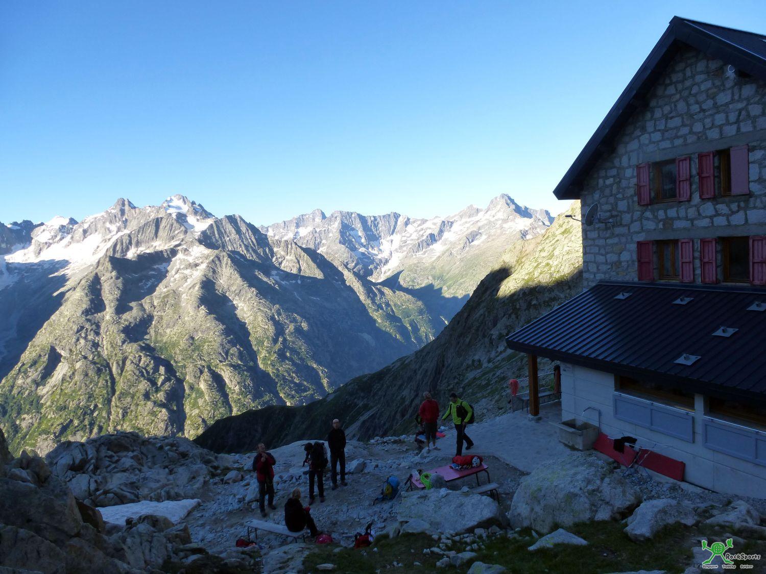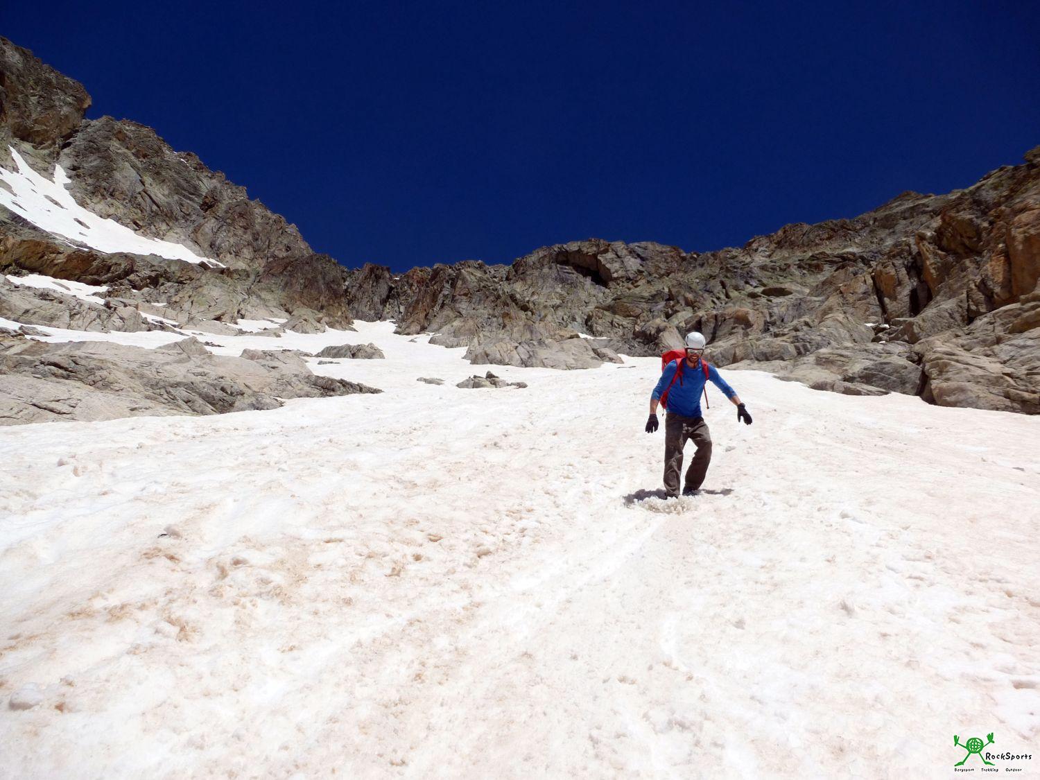 Aiguille Dibona - Visite Obligatoire (VII-, 430 m, 12 SL), Dauphine 16.07.16 - Tobias - 27.08.2016 Die kühne, beeindruckende 400m hohe Felsnadel der Aiguille Dibona (3131 m) in der fernen Dauphine ist hier zu Lande nicht unbedingt allzu berühmt. Zu Mindestens ein Begriff ist aber dennoch den meisten weitgereisten Alpinisten „Ach ja, da gibt es ja irgendwo in der Dauphine so eine schöne Felsnadel“. So ging es auch mir als ich Mitte Juli mit Jürgen in die Dauphine gefahren bin. Das eigentliche Ziel war aber ein ganz anderes... „Vor dem Vergnügen, sie zu ersteigen, steht das, sie zu sehen“ Gaston Rébuffat Es war ein Wochenende Mitte Juli 2016 nach einer Woche mit Kaltfront, polarer Kaltluft und einigem Neuschnee in den nördlichen Westalpen. Nun gut, in der Dauphine hatte es lange nicht die Niederschlagsmengen wie in Chamonix unter der Woche und das Wetter war viel früher wieder besser. Meije Südwand wird also am Wochenende schon gehen, wir fahren… . Wobei die Entscheidung „wir fahren“ in diesem Fall fast 750 km One Way bedeutet. Doch schon ab Grenoble fällt uns so komisches weißes Zeugs auf den höheren Bergen auf. Ein Anruf auf der Promontoirehütte am Fuße der Meije bestätigte die Befürchtung nächtlicher Neuschneemengen in den Höhenlagen der Dauphine die irgendwie kein Wetterbericht so recht auf dem Schirm hatte. Der freundliche Hüttenwirt sagte: “Keine Chance, Meije Südwand im oberen Teil total weiß und alles vereist, mindestens 2 Tage warten.“ Blöd wenn man beim Erhalt dieser Hiobsbotschaft schon fast am Ausgangspunkt in den Tiefen der Dauphine ist und mal wieder nur das Wochenende Zeit hat. Auf der Suche nach Alternativen, um nicht ganz umsonst in die Dauphine gefahren zu sein, kommt aus dem Hinterkopf plötzlich diese Aiguille Dibona hervor. So starten wir also ganz unplanmäßig an die Aiguille Dibona (3131 m) und zum schön gelegenen Refuge Soreiller (2719 m). Der Neuschnee war hier zum Glück kein Problem, denn die Gipfelhöhe ist einfach um ca. 850 m niedriger als die der Meije. Da wir natürlich keinerlei Infos, Topos oder dergleichen dabei hatten, ging es in eine Tour von der wir auf der Hütte noch ein gutes Topo abfotografieren konnten. So landeten wir beim alpinen Sportklettern mit vielen vielen Bohrhaken und gemäßigten, aber anhaltenden Schwierigkeiten in der Route „Visite Obligatoire“. Ein wirklicher „Pflichtbesuch“, denn was die Kletterei betrifft eine absolute Traumtour in allerbestem Granit. Wer hier mal planmäßig hinfährt, für den gibt es sogar Topoguide-Topos von mehreren Touren an diesem Berg in Band 1 und 2. Nachdem der Juli 2016 bei mir von mehreren „missglückten“ Aktionen und Tourenabbrüchen aus verschiedensten Gründen geprägt war, war es dann umso schöner dass es 2 Wochen später Ende Juli im zweiten Anlauf doch noch mit der Meije Südwand (hier ein paar Infos) geklappt hat. In ca. 1h 45min ging von Les Etages (1597 m) hinauf zum Refuge Soreiller (2719 m) welche direkt unter der Südwand der Aiguille Dibona liegt. Am nächsten Morgen ist der Weg zu den Einstiegen dann richtig komfortabel, denn nach knapp 10 min ist man an der Wand und es kann losgehen. Die Sonne kam gegen 8:30 Uhr in den Einstiegsbereich der Wand. Die ersten beiden Seillängen (VI+) führen über sehr kompaktes plattiges Gelände. Der Fels ist aber auf diesen Platten schon so herrlich strukturiert, dass nie unangenehmes Plattenfeeling aufkommt. In der 3. und 4. SL wird es dann steiler und es gilt einige kleinere Dächlein zu überwinden. Die Kletterei ist richtig begeisternd und die Dächer gleichen Turnübungen an riesigen Henkel. Ein toller und fotogener Quergang in der 4. SL gibt dem ganzen zusätzliche Würze. Die 5. SL bietet begeisternde Wand und Verschneidungskletterei und laut einem französischem Topo auch die Schlüsselstelle mit 6a+. Diese besagte VII- ist aber nur eine ganz kurze Passage und wie auch der Rest bestens abgesichert. Topoguide schreibt hier VI+ wie in den vorigen Seillängen. Ein Tick schwerer wie der Rest der Tour ist die Stelle aber schon, von dem her passt VII- ganz gut. Danach wird es für ca. 70 m deutlich einfacher und geneigter bis an den Fuß des markanten Kantenaufschwungs im oberen Teil. Entweder eine gestreckte Länge oder zwei kurze im III-IVer Geländ. Am nun folgenden Kantenaufschwung wird es gleich wieder steiler. Wir entscheiden uns für die schwere Variante rechts der Kante an steilen Rissen. VII+/VIII- dürfte es schon gewesen sein. Laut französischem Topo 6c/A0. Danach weiter auf der Originalroute direkt an der Kante. Nach ca. 4 Stunden Kletterzeit stehen wir am höchsten Punkt der Aiguille Dibona und genießen die Aussicht auf die wilde Hochgebirgslandschaft der Dauphine. Auf dem Normalweg über den Nordgrat ist die Hölle los und viele Seilschaften sind im Auf- oder Abstieg unterwegs. Die Aiguille Dibona scheint unter den Franzosen ein äußerst begehrtes Gipfelziel zu sein. An unserem Hüttenaufstiegstag und auch nun am Tourentag waren von der Hütte aus ca. 15 Seilschaften am Normalweg unterwegs. Wenig unterhalb des Gipfels befindet sich die erste Abseilstelle. Von dort ca. 25 m abseilen und es folgt eine weitere Kette. Hier nochmals ca. 25 m Abseilen in eine kleine Scharte. Von der Scharte geht es auf einem schmalen Band (II, Stelle III) auf der Westseite des Grates entlang bis zum Ende der Felsen. Wie bei uns wird hier oft noch Schnee liegen und der weitere Abstieg führt über den vermutlich meist bestens ausgelatschten Normalweg zurück zur Hütte. Hütte bis Hütte dauerte 5 h und eine wirkliche Traumtour in bestem Granit liegt hinter uns. Viele Grüße Jürgen und Tobias |