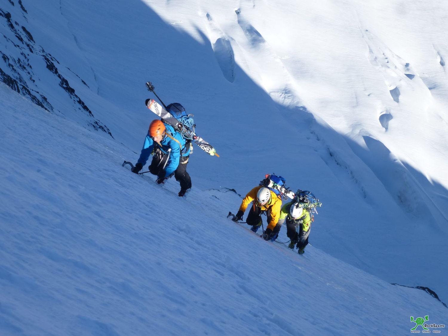 Äbeni Flue - Nordwand (bis 55°, 750m), Berner Oberland 26.05.17 - Tobias - 18.07.2017 „ Ein strahlender Kranz von hohen Gipfeln umrahmt den Talschluss von Lauterbrunnen. Völlig überwältigt verharrt hier der Wanderer vor einem der gewaltigsten Amphitheater der Alpen. Vom Mönch über Jungfrau, Gletscherhorn, Ebenefluh, Mittaghorn, Großhorn, Lauterbrunner Breithorn und Tschingelhorn bis hinüber zum Gspaltenhorn reiht sich ein allerschönster Berg an den anderen…“ „Bei einer Wandhöhe von 750 Metern weist sie [die Ebenefluh Nordwand]eine Breitenausdehnung von fast einem Kilometer auf ist fast durchweg 50 bis 55 Grad steil und bietet so der Phantasie und dem technischen Geschick des Bergsteigers beinahe unerschöpfliche Möglichkeiten. Demzufolge ist diese Flanke bereits an den verschiedensten Stellen und auf den verschiedensten Wegen durchstiegen worden, die sich eigentlich gar nicht so recht als neue Routen ansprechen lassen.“ aus: Erich Vanis - im steilen Eis Die jüngsten intensiven Schneefälle im Hochgebirge ließen in Kombination mit dem super Wetter übers Christi-Himmelfahrts-Wochenende beste Bedingungen in den klassischen Eiswänden erhoffen. So starten wir in größerer Gruppe zu fünft ins Berner Oberland und machen uns auf zur Äbeni Fluh (3960 m) Nordwand. Von Interlaken Ost geht es mit dem Zug nach Lauterbrunnen und von dort mit dem Bus weiter nach Stechelberg (910m). Nun wartet ein wundervoller, aber langer, langer 1800 Hm Hüttenaufstieg zur Rottalhütte (2755 m). Wir dürfen die Ski ganze 1400 Hm bis etwas oberhalb der Bäreflue tragen (ca. 2300m). Der Winterraum der Rottalhütte, welcher quasi die Hütte selbst darstellt, ist bestens eingerichtet und in top Zustand. Holz, Töpfe, Bier, Limonade alles ist ausreichender Menge vorhanden. Toll, dass es solche Hütte gibt! Am nächsten Morgen starten wir gegen 03:45 Uhr und fahren hinter der Hütte in den Gletscherkessel ab um auf der anderen Seite des Talkessels wieder talauswärts zu fahren. An geeigneter Stelle werden die Felle aufgezogen und wir steigen im großen rechtsbogen unter die Wand. Gegen 05:45 Uhr geht es dann los und wir steigen in die Wand ein. Schon die ersten Meter zeigen, dass sich die Hoffnung auf beste Verhältnisse erfüllen sollte. Hier einige Bilder aus der Wand: Nach 3 h stehen wir gegen 08:45 Uhr am Gipfel der Äbeni Fluh (3960 m). Bei windstillem Wetter und bester Fernsicht genießen wir eine gemütlich Gipfelpause. Bei tollen Blicken auf die Aletschhorn Nordwand fahren wir zur Hollandiahütte ab. Während ich über die Lötschenlücke ins Lötschental abfahre und aufgrund familiärer Verpflichtungen die Heimreise antrete, bleibt der Rest der Gruppe noch zwei Tage im Berner Oberland. Es folgte bei ihnen, die Haslerrippe aufs Aletschhorn und der Rückweg über Breithorn und den Beichtpass in Lötschental. Äbeni Flue (3960 m) – Nordwand: - 1. Begehung: 02.08.1895 Claude A. Macdonald, Christian Jossi sen. und Peter Bernet (im rechten Wandteil und z.T. im Fels) - 1. direkte Begehung: 04.08.1937 Peter Aschenbrenner und Wastl Mariner (heutige klassische Eiswand) - Schwierigkeit: max. 55° - Wandhöhe: 750 Hm - Kletterzeit: 4-6 h (Vanis Angabe) Literatur: SAC Hochtourenführer Berner Alpen Im steilen Eis 80 Eiswände in den Alpen Neuausgabe 1980 Erich Vanis SAC-Karten: 1:25000: 1248 Mürren 1:25000: 1249 Finsteraarhorn 1:25000: 1268 Lötschental Viele Grüße Martin, Markus, Manfred, Flo und Tobias RE: Äbeni Flue - Nordwand (bis 55°, 750m), Berner Oberland 26.05.17 - fatrock - 12.11.2017 Vielen Dank für den interessanten Bericht über Eure Begehung der Ebnefluh N Wand,bei der ich mich auch an unser Erlebnis in dieser mächtigen Eisflanke erinnere. Aber beginnen wir doch von vorn: Nachdem Gregor und ich 1992 nach einem Fehlversuch am Reissend Nollen uns erfolgreich dem Schreckhorn ( www.camptocamp.org/routes/186706/fr/schreckhorn-pilier-s ) zu gewandt hatten,unternahmen wir,ab da mit Christian als Verstärkung unsere erste längere Vorbereitungs Eis Tour an der Blüemlisalphorn N Wand ( www.hikr.org/tour/post85366.html#comments ). Nach der Rückkehr ins Tal und dem Ortswechsel nach Stechelberg im hinteren Lauterbrunnental begannen wir den 1800 m hohen Aufstieg zur Rottalhütte,bei der ich mit 6 h von uns dreien zwar die meiste Zeit benötigte,aber die offizielle Zustiegsdauer zumindest noch nicht all zu stark überschritt. Nach dem frühen Aufstehen am nächsten Tag wurde erst der flache Rottal Gletscher überquert und dann der in diesen mündende spaltenreiche Zusstiegsgletscher,der uns einige Zeit kostete,bis zu seinem oberen Ende auf ca.3200 m verfolgt,wo wir dann erst mal Vorbereitungen zu treffen hatten für den Einstieg in die bis zu 55 Grad steile Wand,die ab hier immer noch 750 mH über uns aufragte und schon in den unteren Abschnitten ausgedehnte Blankeiszonen bereithielt,deren Umfang mit ansteigender Wand Höhe noch weiter zunahm,was dann doch auch einige Erholungspausen und irgendwann auch die Umstellung vom gleichzeitigen Gehen zum Seillängen weise Sichern erforderlich machte. Aufgrund dieser situativen Gemengelage und der nicht gerade leichten Rucksäcke,die für weitere Hütten Übernachtungen und noch einen weiteren Gipfel ohne Zwischenabstieg ins Tal gepackt waren,zog sich die Sache auch wegen der allmählich nachlassenden physischen Reserven doch so in die Länge,dass wir den Ebnefluh Gipfel erst am späten Nachmittag erreichten. Als wir den Kilometer langen Abstieg über einen flach abfallenden Gletscher dann endlich hinter uns hatten,war es spät am Abend,als wir die Hollandia Hütte betraten. Da wir einen ausgeruhten Zustand und frühen Aufbruch für die nächste Tour aufs Aletschhorn benötigt hätten,verschoben wir diese um einen Tag und nutzten die dazwischen liegende Zeit erst mal zum Schöpfen neuer Kräfte. Und statt der im Vergleich zur Ebnefluh Nordwand,die uns wirklich einiges an Kräften abverlangt hatte,noch mal zusätzlich um die Hälfte höheren direkt 