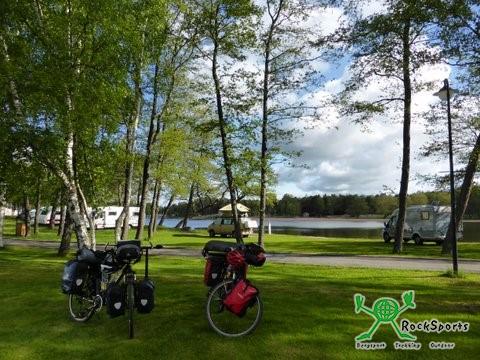 Nachdem es in der Nacht geregnet hatte, waren wir sehr froh, kein nasses Zelt zusammen packen zu müssen. Unsere Route führte uns größtenteils durch Waldgebiete mit wenigen Häusern oder Orten. Der Wind blies uns meistens in den Rücken und so kamen wir auf der welligen Strecke recht gut vorwärts. Vielfach verlief die Strecke auf Nebenstraßen und auch auf einsamen Waldwegen. Die Natur ist hier noch einiges zurück, manche Bäume haben noch fast kein Laub. An idyllischen Seen und schön angelegten Golfplätze ging es vorbei was uns etwas Abwechslung bot. Zum Vätterensee ging es steil hinunter auf den Campingplatz direkt am See. Hier nahmen wir uns ein kleines Zimmerchen, denn die Temperaturen lagen zwischen 10°C und 17°C tagsüber trotz zeitweise sonnigen Abschnitten am heutigen Tag. Nachts kühlt es bis auf 3°C ab.