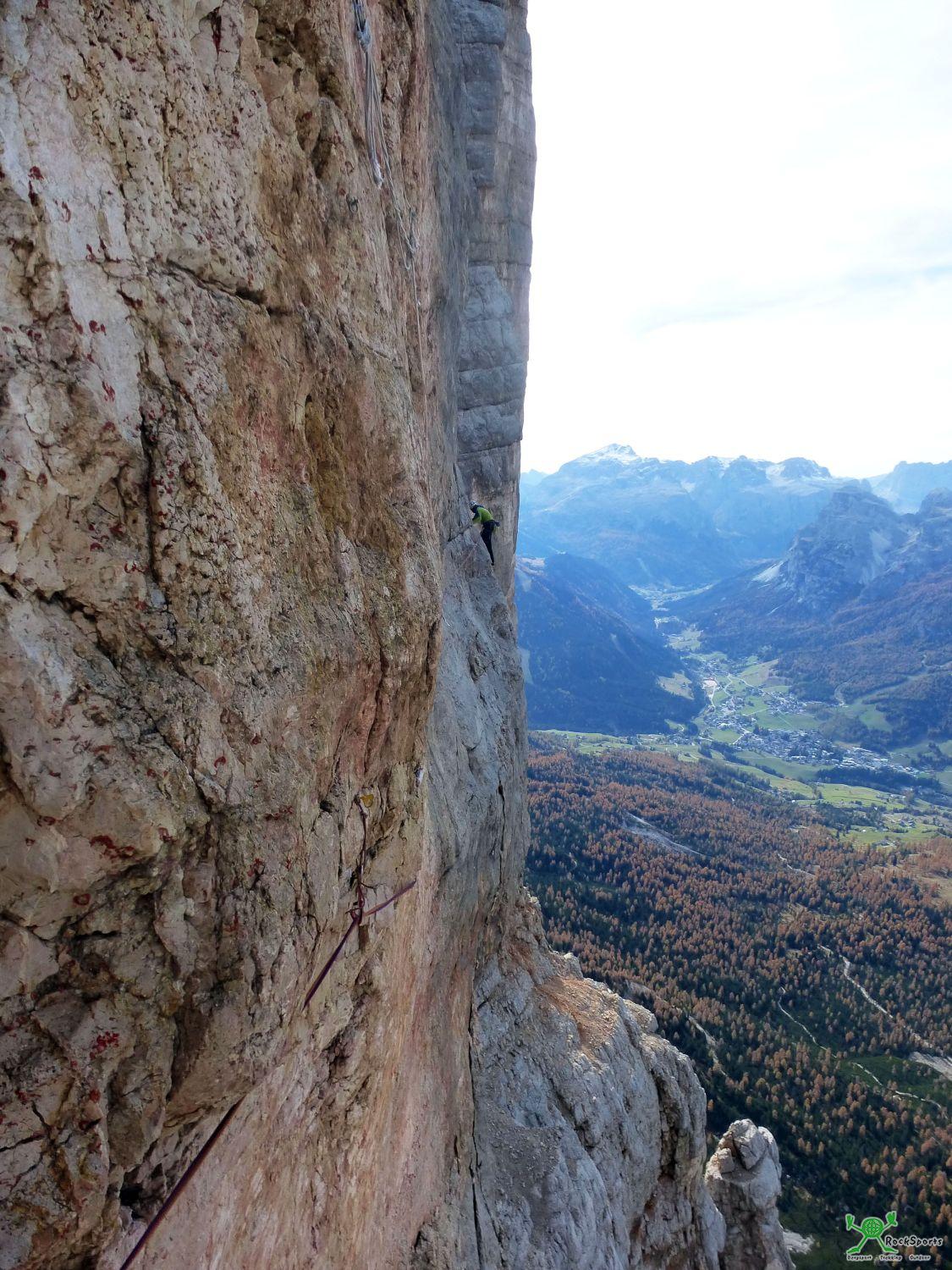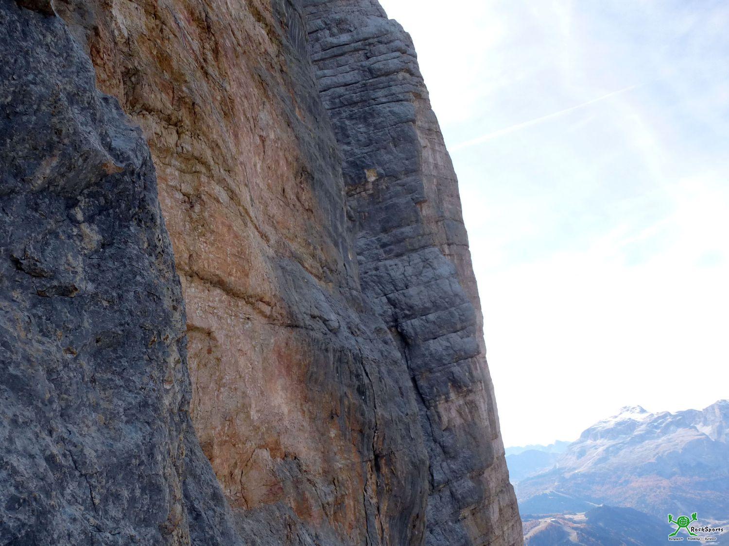 Am Ende des Tages und am Ende dieser Suche nach Antworten steht die neue „Oblinger-Variante“ am Mittelpfeiler des Heiligkreuzkofel. Als Schwierigkeitsbewertung für diesen Quergang schlagen wir den VIII. Grad vor. Die Originalführe führt in dieser 3. SL vom Stand ein paar Meter nach oben, quert dann waagrecht nach rechts bis zu einem Haken. An diesem Haken erfolgt üblicherweise ein gegenseitiges Ablassen um 6-7 m nach unten. Derzeit (Oktober 2017) befinden sich übrigens überall diverse alte Fixseile in diesem Bereich (nicht nur auf den 6-7 vertikalen Metern). Nach dem Ablassen wird auf einer Art Steilplatten-Rampe in wieder grauem Fels weiter nach rechts gequert. Die nun neue „Oblinger-Variante“ stellt die eigentlich logische Linie in diesem Wandbereich dar, denn sie ist die natürliche Fortsetzung der eben erwähnten Steilplatten-Rampe nach Links. Vom Stand vor der 3. SL führt die neue Variante nun nicht nach oben wie die Originalführe sondern zunächst 1 m nach unten (ca. III. Schwierigkeitsgrad) und quert dann umgehend waagrecht nach rechts ins gnadenlos exponierte leicht überhängende Gelände hinaus. Zunächst geht es echt super und es gibt erstaunlich gute Griffe (max. VII+). Doch nicht zu früh freuen. Das dicke Ende und die VIII er Züge kommen zum Schluss, kurz bevor man wieder auf die Fixseile der Originalführe trifft. Zwei Normalhaken (belassen) und drei Friends dienten der Absicherung.