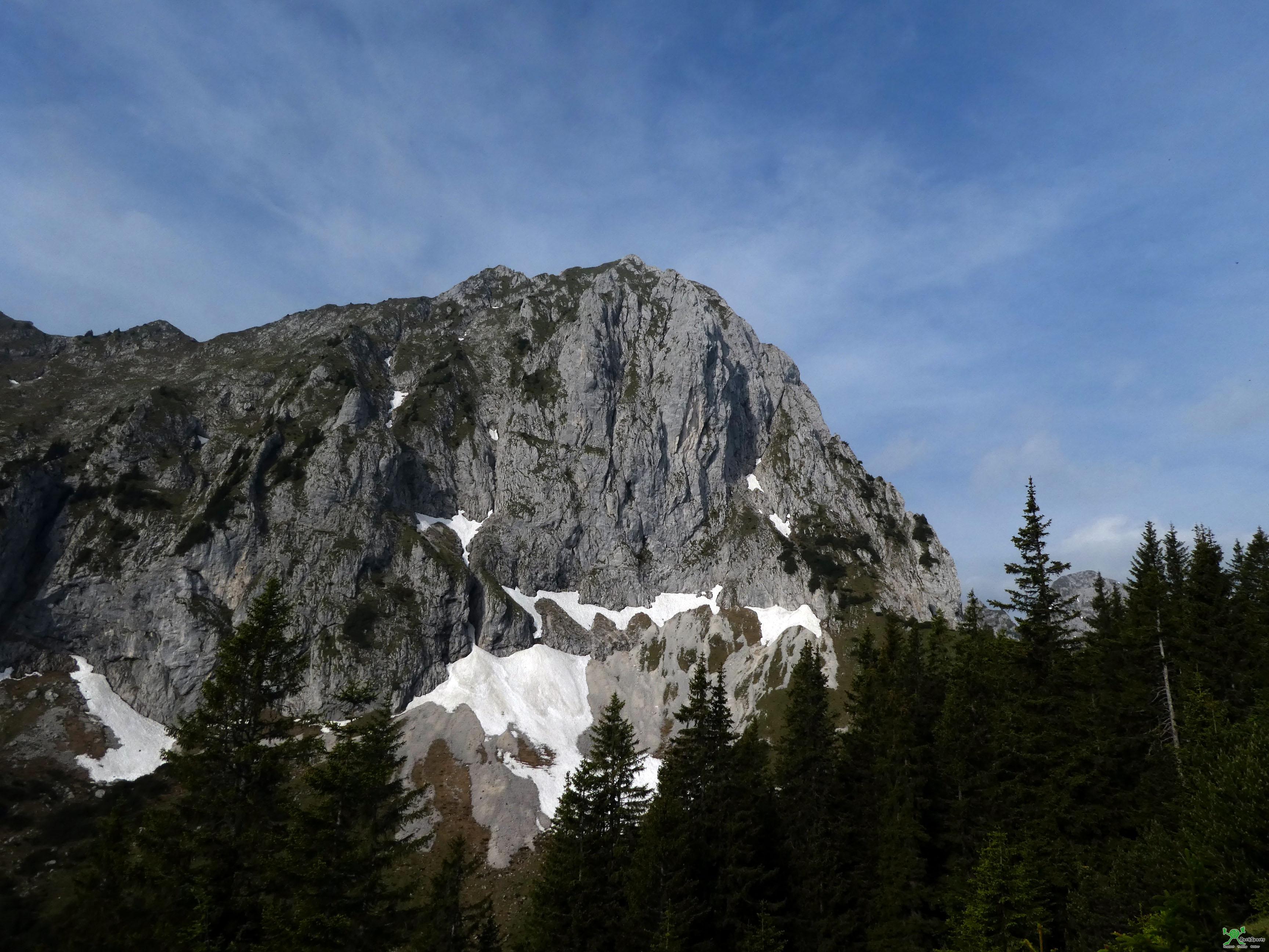 Die Wand besitzt zwei Pfeiler. Links den "Marktoberdorfer", rechts den "Pfrontner". Bis zum Einstieg ~1,5h mit Fahrrad.