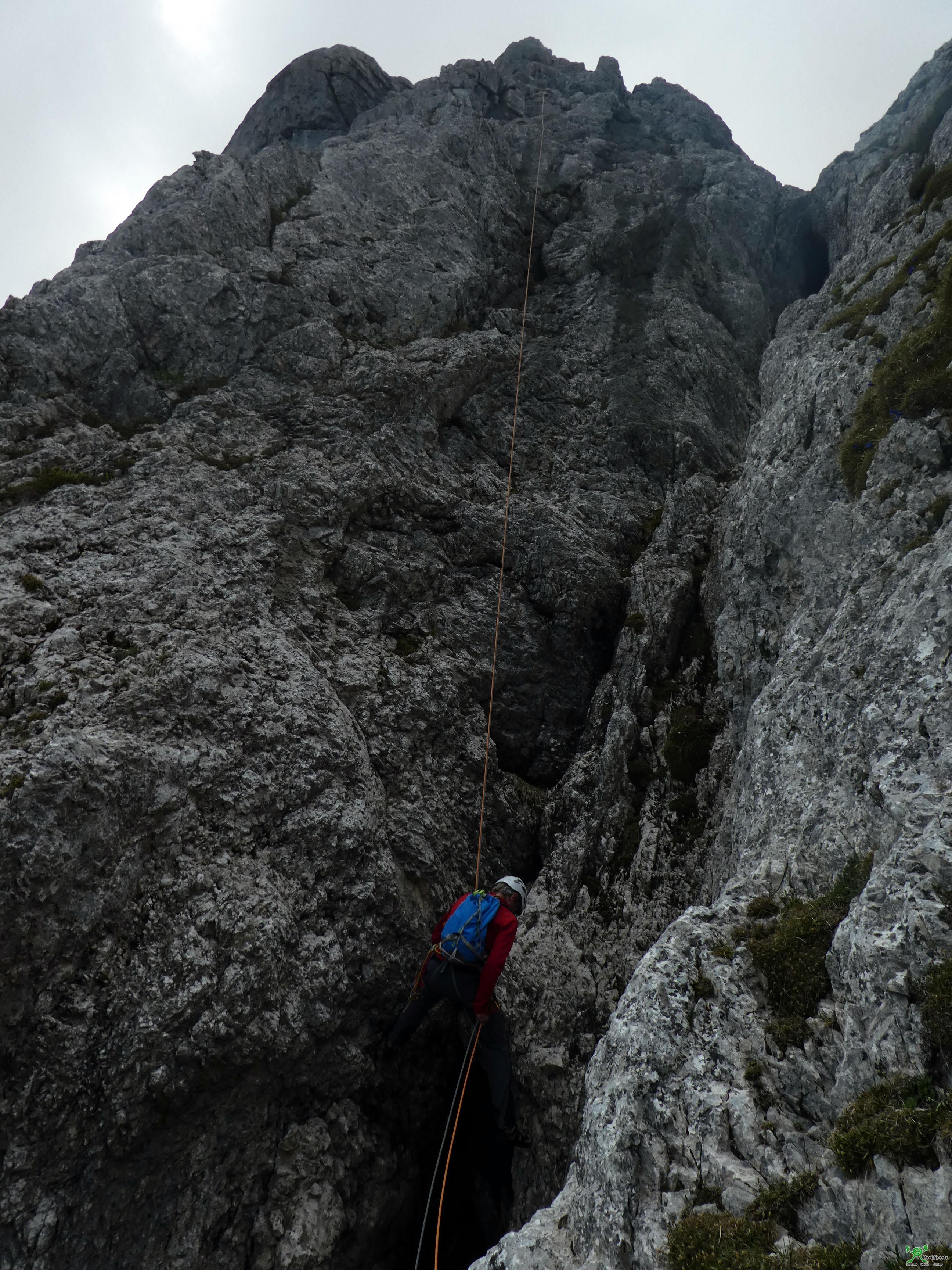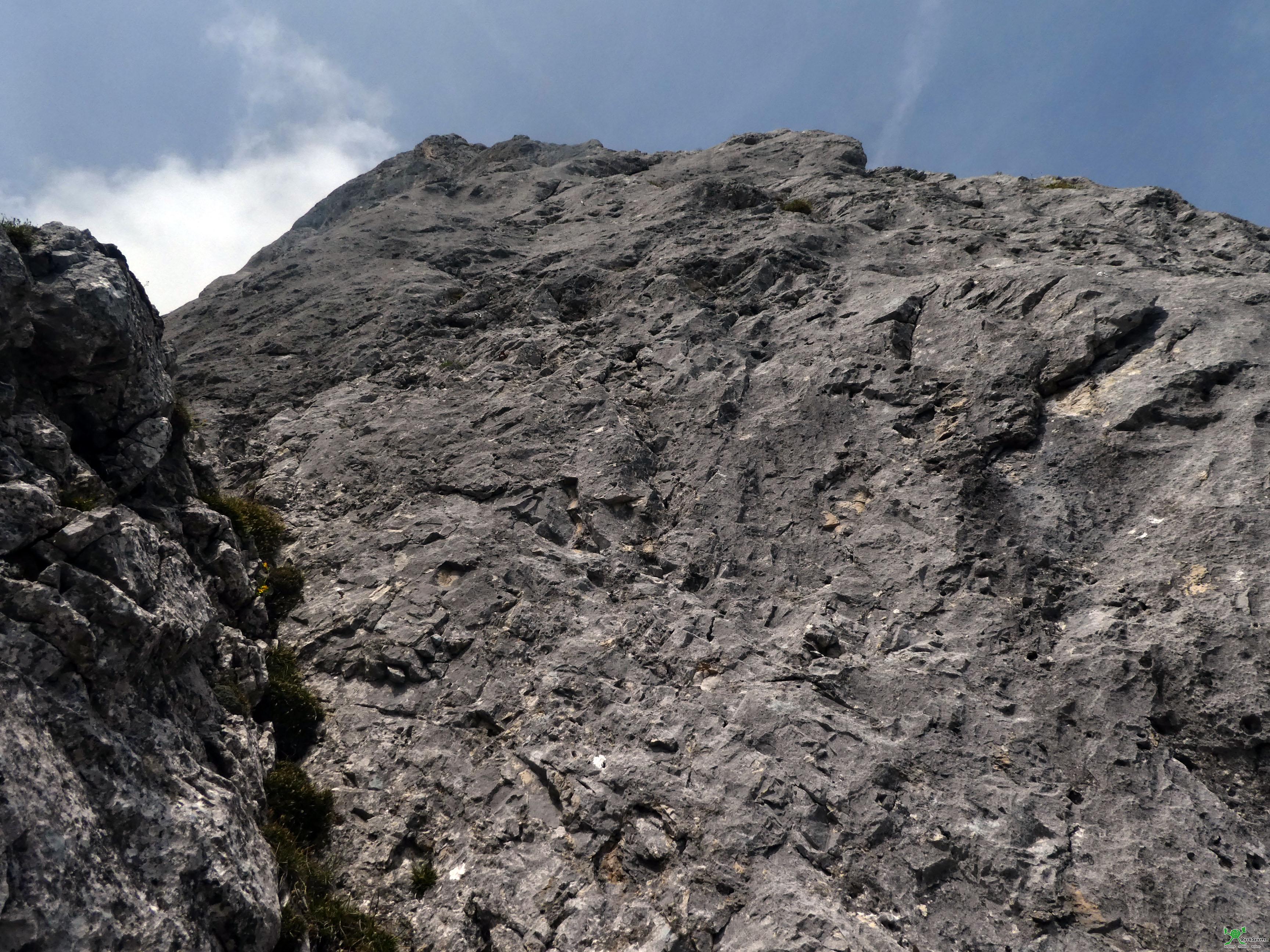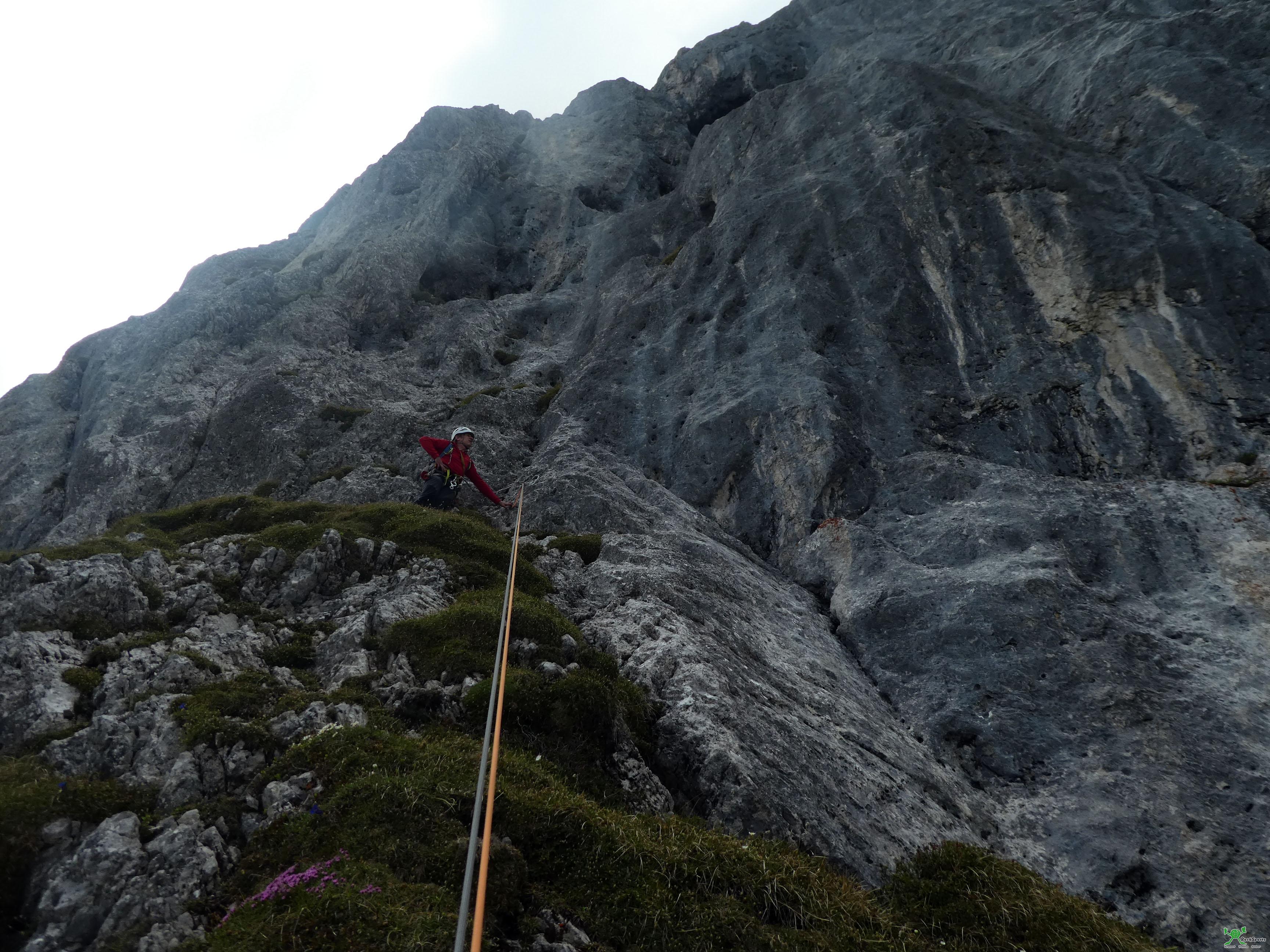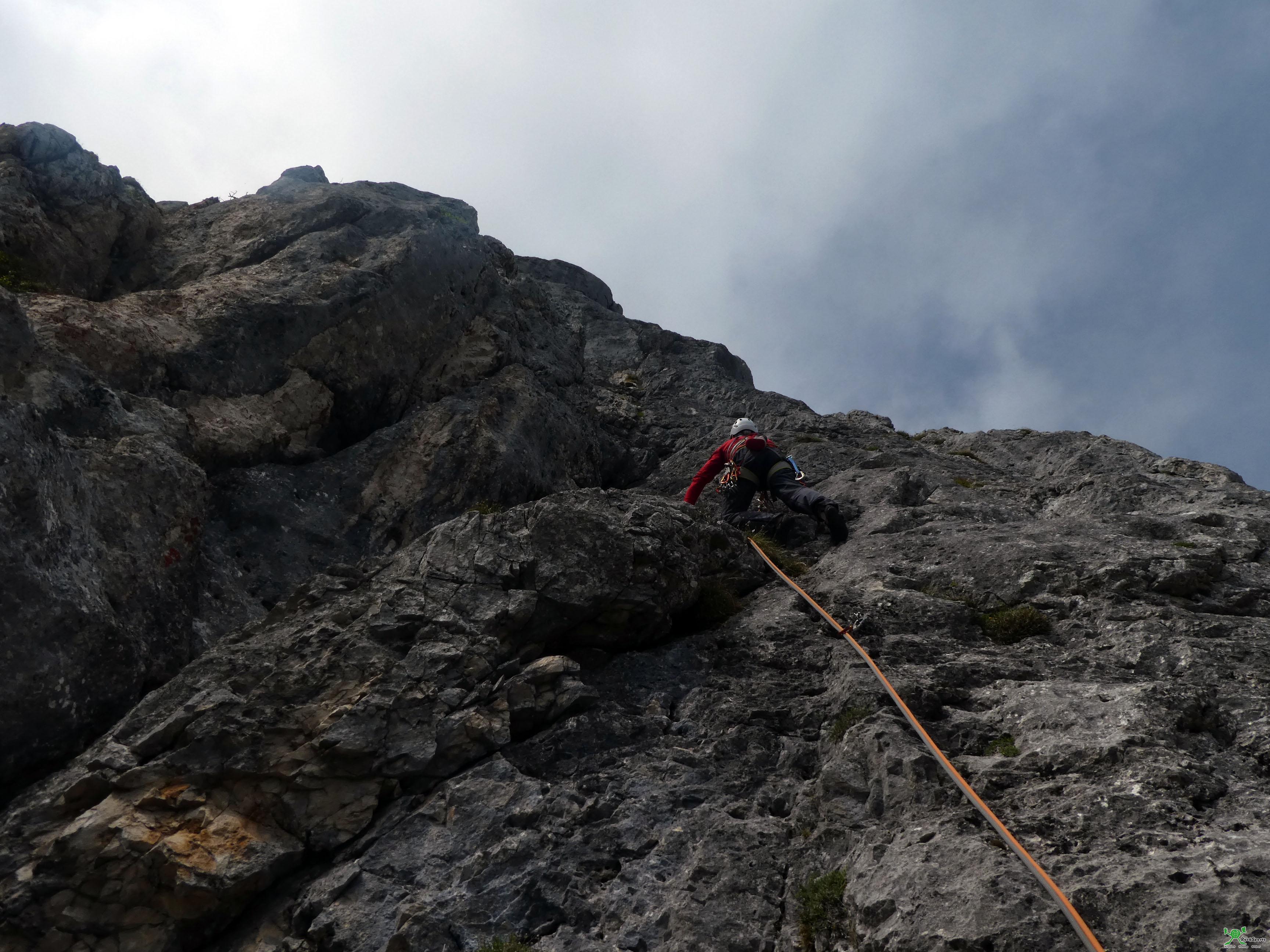 Ab dem Pfeilerkopf (Kletterzeit bis hier etwa 3,5h) kann, mit einem Stand außerhalb der Route (siehe Topo) abgeseilt werden. Wir sind weiter zum Gipfel. dazu folgt man dem schrofigen Grat (etwa 150m bis III, nicht saniert) und steigt zuletzt über steile Wiesen zum gelegentlich sichtbar werdenden Gipfelkreuz auf (etwa 45min ab dem Pfeilerkopf).