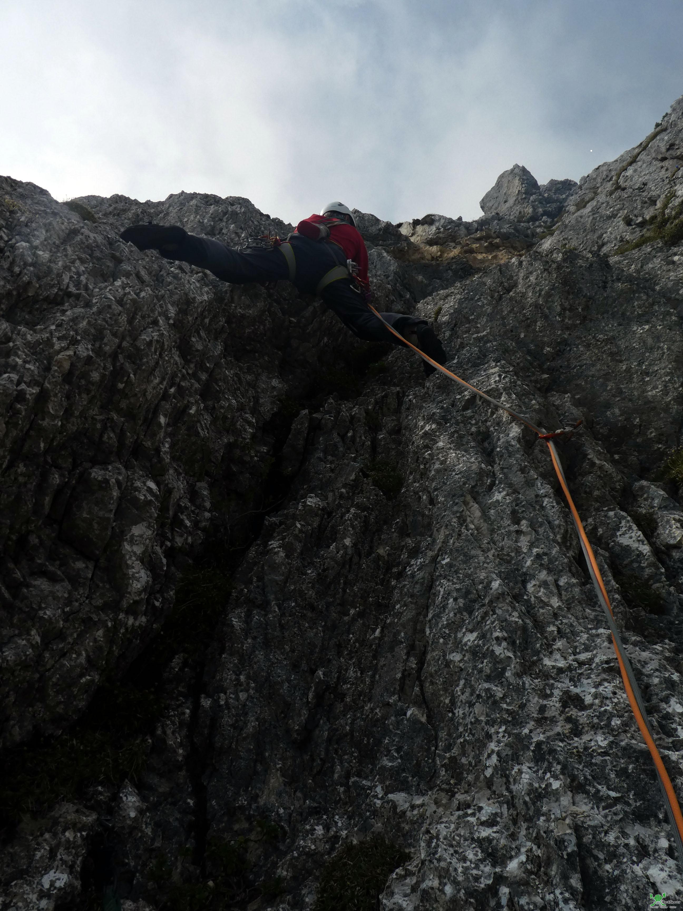 Die Kletterei ist seit der Sanierung objektiv einigermaßen sicher, aber immer noch alpin und durchaus Anspruchsvoll. Der Weg lässt sich mit dem unten stehenden Topo mit entsprechender Erfahrung finden, es darf aber durchaus an einigen Stellen etwas gesucht werden. Es müssen schwere Züge auch zwischen den Haken geklettert werden. Mittlere Friends sind durchaus hilfreich, über weite Strecken ist der Fels aber sehr sicherungsfeindlich. Die Felsqualität ist wechselhaft. Um unteren Teil recht brüchig, Teilweise auch in den schweren Passagen. Weiter oben kommen einige technisch anspruchsvolle Plattenstellen mit gutem Fels.