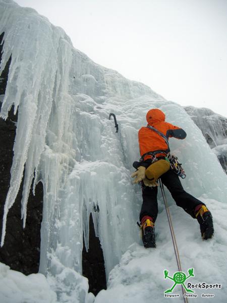 1.Länge: WI 2, 2.Länge: WI 5 (ziemlich konstant steil und kraftraubend)