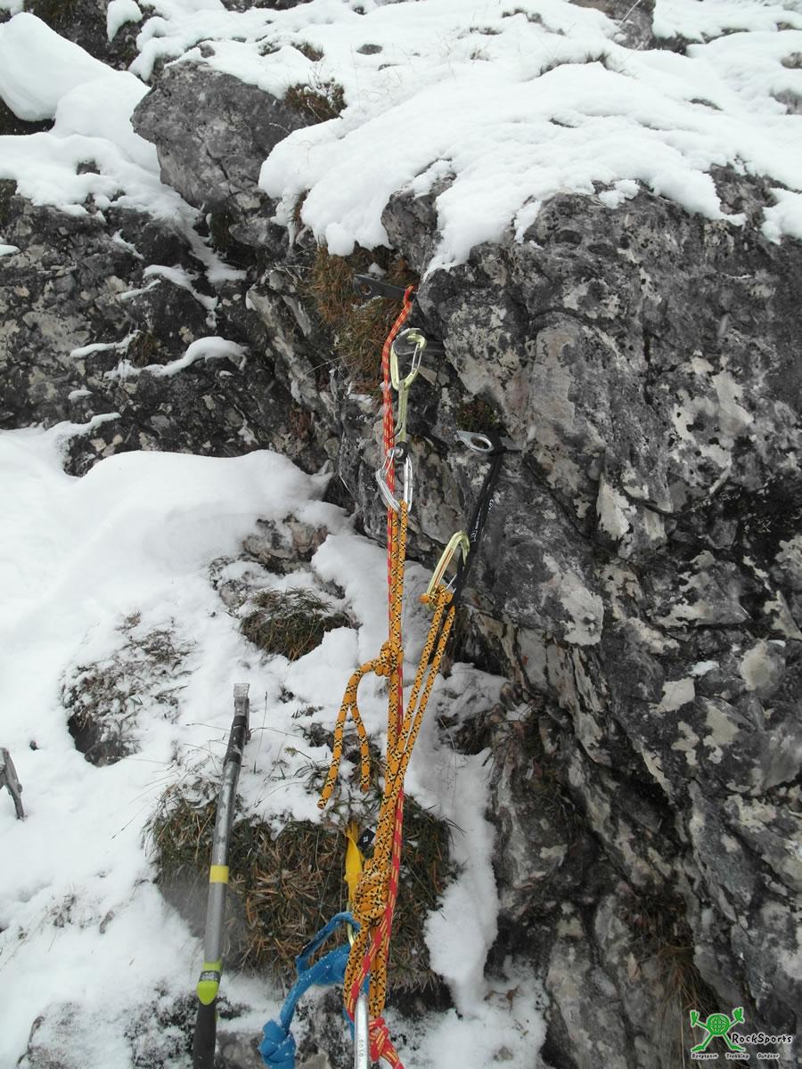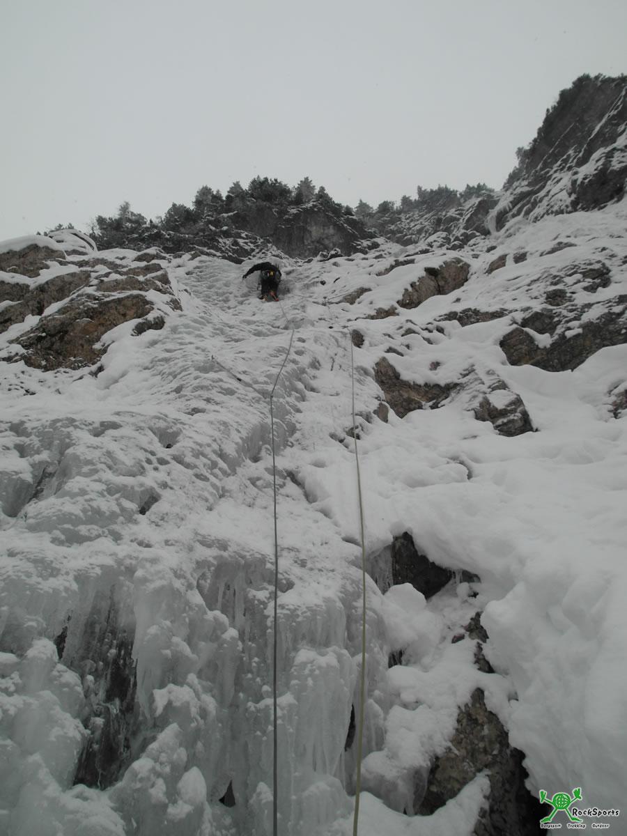 Also sind wir die erste SL bis zum BH-Stand geklettert. in der 2. SL haben wir mit einigen Schlenkern einen Vorhang mitgenommen, danach selbst einen Stand gebastelt. In der Dritten ging es auf Fels mit Moos/Schlamm/Schneeauflage weiter.