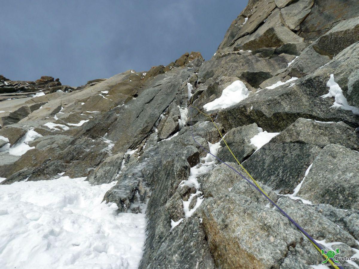Der Bergschrund war ganz rechts problemlos zu überwinden. Es folgen ca. 70-80m Schneegelände (45°) bis an den Fuß der ersten Seillänge des Direkteinstieges. Gegen 07:30 Uhr geht es los und in der ersten Seillänge auch gleich mal ordentlich zur Sache. Die eine oder andere Stelle dürfte durchaus eine kratzige M6 wiederspiegeln. Insgesamt hatte es in dieser Seillänge nicht mehr allzu viel Eis und Schrauben ließ sich keine einzige mehr drehen. Dennoch gab es immer mal wieder kleine nützliche Eisbätzchen. Zur Absicherung gibt es ein paar Normalhaken und Cams können meist gut gelegt werden. Vermutlich kommen hier bei wenig Eis auch mehr Normalhaken zu Tage. Am Stand stecken zwei Bohrhaken. Allerdings sehr weit rechts und etwas unbequem auf der Platte.