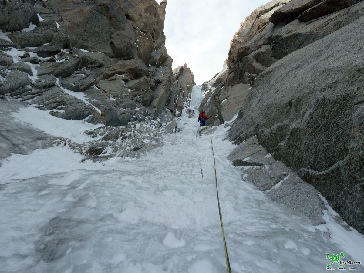 Nun hat man den zentralen Teil des Supercouloirs erreicht und es warten viele, viele Meter genüsslicher Eiskletterei im WI 3 Bereich, ca. 7 Seillängen. Im Eis gab es überall deutliche Begehungsspuren und viele Tritte und Hooks. Insgesamt war die Eismenge überall absolute ausreichend auch wenn man beim Schraubensetzten etwas schauen musste und manchmal auf Fels traf. Im Aufstieg haben wir uns nicht immer an die vorhandenen Bohrhakenstände gehalten sondern meist volle 60 m oder gleich am laufenden Seil geklettert. Nachdem wir am Vortag an der Triangle auch noch eine unserer fünf mitgeführten Eisschrauben verloren hatten, fällt die Absicherung mit noch vorhandenen vier Eisschrauben eher etwas sportlich aus. Das Ambiente ist gewaltig und einfach großartig. Herrlich in solchem Gelände Eisklettern zu können.
