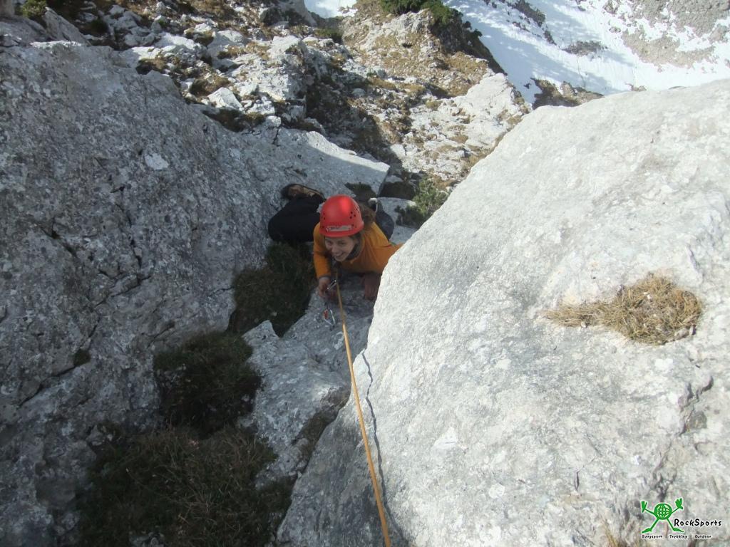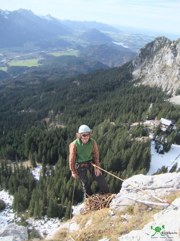 Wir haben mehrere Standplätze übersprungen (bei 150 m Kletterlänge sind 7 Stände eingerichtet), bis auf die Schlüssellänge in schönem Fels ist der Rest eher von geringer Festigkeit.