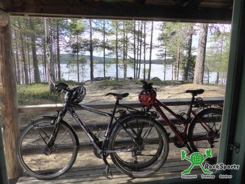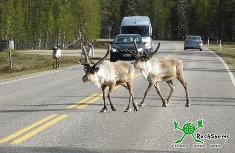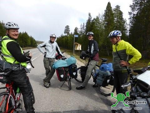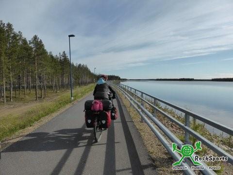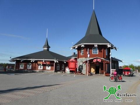 08.06.2015 Rovaniemi – Sodankylä 131,8 km und 688 HmUm 7 Uhr machten wir uns bei 4°C, und leichter Bewölkung von Rovaniemi auf. Schon 8 km später erreichten wir Santa Claus Village, aber dort wo sonst ein riesen Trubel um den Nikolaus stattfindet, herrschte noch absolute Stille. Dort passierten wir auch den nördlichen Polarkreis. Es folgte ein ständiges Auf und Ab und das Wetter verschlechterte sich zusehends und wir mussten uns noch zusätzlich eine wärmende Schicht überziehen. Zum Glück erwischte uns nur ein kurzer Schauer aber den Wind hatten wir heute gegen uns und so gestaltete sich der ganze Tag recht mühsam. Zur Mittagszeit begegnete uns eine finnische Fernradlerin und gegen Abend trafen wir noch einen finnischen Radler, der Finnland umrundet. So, und durch die zahlreichen Seen, kam wenigstens etwas Abwechslung in den Tagesablauf. Auch die ersten Rentiere bekamen wir zu sehen. Nach 11 Stunden erreichten wir ziemlich erledigt den Campingplatz in Sodankylä, wo wir uns wieder eine Hütte anmieteten. Zum Glück gab es im Ort einen großen Supermarkt, wo wir noch einkaufen konnten. Sonst war unterwegs nichts zu finden.