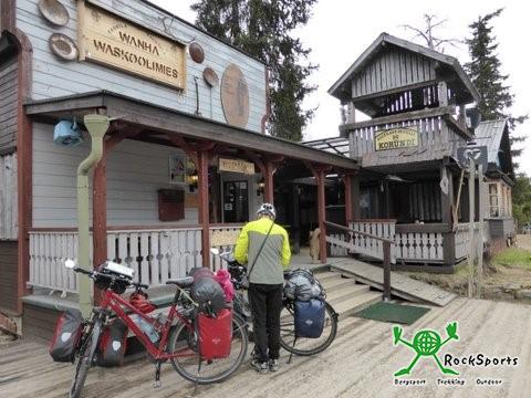 Bei herrlichem Sonnenschein, aber immer noch kühlen Temperaturen von 10°C, machte das Radeln heute richtig Spaß. Lange Zeit ging es auf fast ebener Strecke und Windstille vorbei an zahlreichen Seen. Häufig begleiteten uns Flüsse, die zur Stromgewinnung aufgestaut wurden. Die Wälder wurden durchsichtiger und niedriger und immer wieder konnten wir einige Rentiere entdecken. Auch viele Moore trugen zur Abwechslung der Landschaft bei. Zwei Fernradler begegneten uns heute, bevor wir in der Goldgräberstadt Tankavaara unsere Tour für heute beendeten. In einer urigen Hütte kamen wir unter und hatten den Mittag über Zeit, die alte Goldgräberstadt zu besuchen.