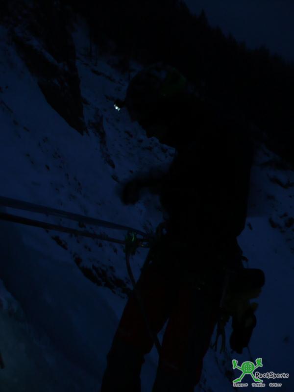 Frank klettert hinter her, er hat die Nacht auf seiner Seite, sucht neues Eis und neue Tritte, er hat eine Lampe auf .