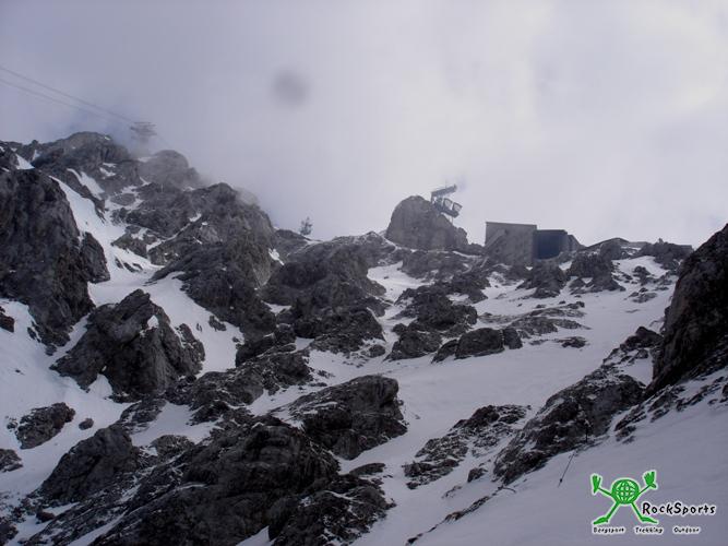 Route: Talstation Tiroler Zugspitzbahn (Ehrwald-Obermoos, 1228m) – Gamskar („Tiefenter Wiesen“)- Seilbahnstütze (ca. 2000m)- Querung ins österreichische Schneekar- Wiener Neustädter Hütte (2213m)- Schneerinne hinauf auf den Kamm- über Kamm zur Gipfelstation der Zugspitzbahn (2959m).