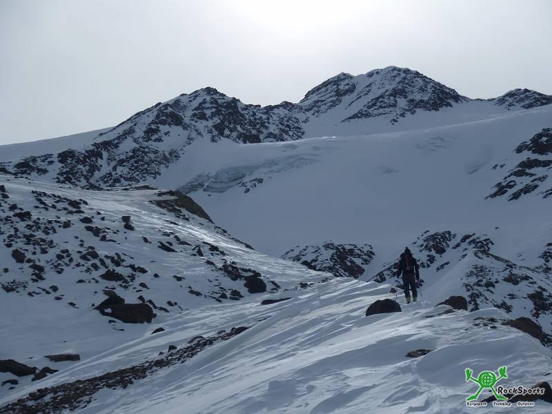 Wieder ein ewiger Hatsch, ich bin froh über die Ski. Wir starten früh am Morgen, wie gestern ist auch heute der Schnee bretthart, aber die Motivation ist riesig. Es gibt 2 verschiedene Aufstiegsvarianten von der Zufallhütte auf die östliche Veneziaspitze, für heute empfanden wir die obere als venünftiger. Diese führt auf Höhe der Marteller Hütte nach links, wobei man einen großen Hang quert, dann ein kleines Stück abfährt und am besten über den markannten Grat nach rechts in Richtung Veneziaspitze weitergeht. Am Ende des Grats halten wir uns linker Hand bis in eine kleine schmale Scharte, welche wir in Spitzkehren aufsteigen. Jetzt beginnt der Schranferner, ein flacher massiver Gletscher über den wir keine Spalten gesehen haben, der Schnee war weiterhin hart.
