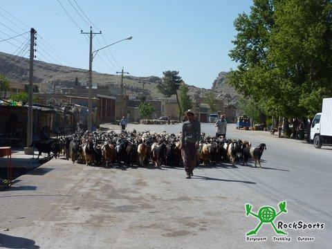 Von Persepolis ging es zunächst noch 7 km auf der Autobahn weiter, bevor wir auf eine Landstraße abbiegen konnten. Dort begegneten und viele Ziegen- und Schafherden. Bauarbeiter und Schafhirten sprachen uns ebenso an wie Auto und Mopedfahrer. Blieben wir irgendwo stehen, so scharten sich immer gleich alle umstehenden um uns. Alle wollen wissen, woher wir kommen, wie es uns im Iran gefällt, ob sie uns helfen können, wie wir heißen, ob wir verheiratet sind und ob wir Kinder hätten.