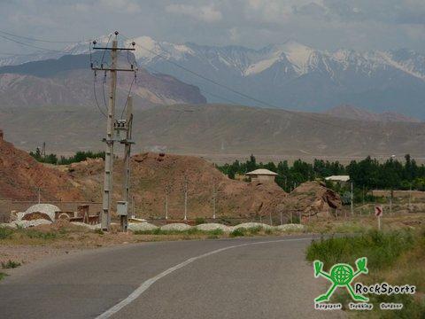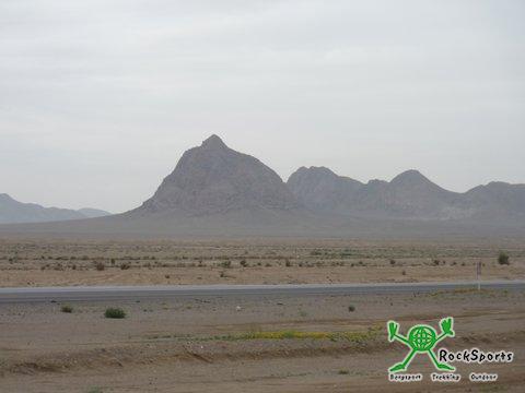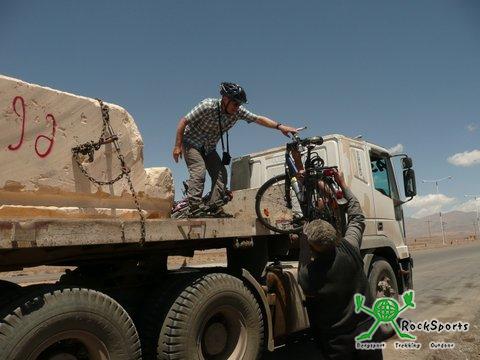 Wir standen mit fertig gepackten Rädern kurz vor halb acht vor dem Frühstücksraum. Außer uns war niemand zu sehen. Kurz vor acht bemerkten wir in einem Raum, unter einem Knäuel von Decken, jemanden liegen. Wir klopften und es erhob sich unser Rezeptionist, der verschlafen hatte. Er telefonierte noch kurz um uns dann zu erklären, dass es doch kein Frühstück gäbe. So fuhren wir also ohne Frühstück, mit 2 Keksen, die wir noch hatten und einem Schluck Wasser im Magen, los. Direkt nach dem Ortsausgang - Abarkuh liegt auf 1500 m Höhe und ist eine Oase - ging es in die Wüste. Die Straße war gut aber fast die ganze Strecke bis zum nächsten Ort verlief pfeilgerade durch die Sand- und Steinwüste. Endlose Weite breitete sich um uns aus und das Thermometer stieg auf 31°C an. Die letzten Kilometer zum ersten und einzigen Ort nach 60 Kilometern ging es auf 1900 Meter hinauf und die Steigung samt Gegenwind machte uns sehr zu schaffen. Der Ort war trostlos aber zumindest gab es etwas zu trinken. Sofort scharten sich wieder einige Männer um uns mit den üblichen Fragen. Mit unserem „Ohne Wörter“ Wörterbuch versuchten wir zu erfahren, ob wir evtl. mit dem Bus nach Yazd weiter fahren könnten. Wir erfuhren, dass zwar ein Bus fahre, dieser aber unser Gepäck samt Fahrrädern nicht mitnehmen werde. So fuhren wir mit den Rädern zum Ortsausgang und stellten uns an die Straße, um von einem Pickup oder LKW mitgenommen zu werden. Wieder gesellten sich einige Männer zu uns und gleich der erste Truck, der mit 2 schweren Marmorblöcken beladen war, wurde angehalten. Es klappte, und der Fahrer nahm uns mit bis nach Yazd. So fuhren wir 75 Kilometer über das beeindruckend schöne Shirkuh- Gebirge mit tollen Felsformationen und dem 4075 m hohen Shir Kuh.