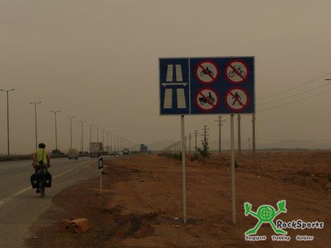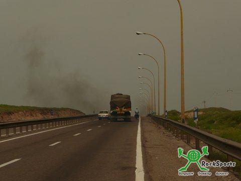 Nach dem Ortsausgang von Ardakan ging es bis Nain, das wieder auf 1562 m Höhe liegt, durch die Geröll- und Salzwüste Dasht-e Kavir. Begünstigt durch etwas Rückenwind kamen wir auf der teilweise recht schlechten Straße trotzdem gut voran. Die ersten 60 km waren flach, danach ging es in leichter Steigung weiter. Die letzten 25 Kilometer drehte der Wind wieder und blies uns als Gegenwind ins Gesicht. Auch der permanente LKW Verkehr und der meist fehlende oder sehr schlechte Standstreifen erforderte hohe Konzentration. So gelangten wir gegen 14:30 Uhr zu unserem Hotel in Nain, das außerhalb der Stadt lag.