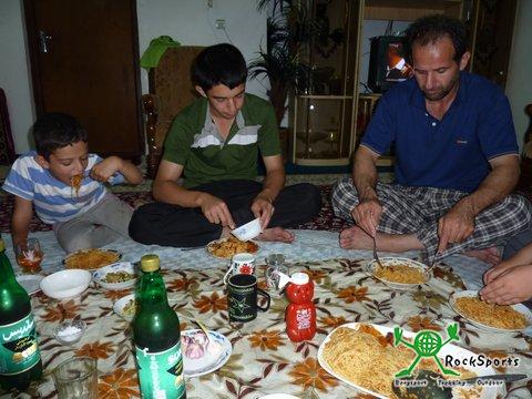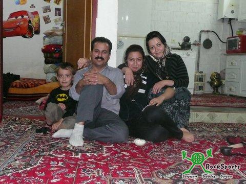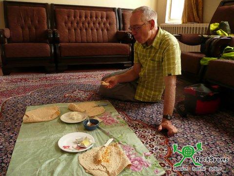 Von Dehbid aus ging es gleich wieder mit Gegenwind bergauf, bis wir nach 17 Kilometern die Passhöhe auf 2565 m erreichten. Mit Erreichen der Passhöhe drehte der Wind und in flotter Fahrt ging es hinunter nach Surmaq, wo wir nach 60 Kilometern die Autobahn wieder verlassen konnten und auf guter Fahrbahn Richtung Abarkuh weiter fuhren. In einem kleinen Ort wurden wir von einem Mann aus dem fahrenden Auto angesprochen. Er lud uns in sein Haus ein und wir sollten seine Gäste sein. Wir lehnten das Angebot zunächst 2 Mal ab, konnten seinem dritten Versuch aber nicht widerstehen und fuhren ihm bis zu seinem Haus, das etwas abseits der Hauptstraße lag, nach. Dort wurden wir von den übrigen Familienangehörigen zunächst herzlich begrüßt. Danach wurde uns das Haus gezeigt, bevor es in den riesigen Garten mit vielen verschiedenen Obstbäumen ging. Zum Anwesen gehörte eine Hühnerfarm und die Familie war recht wohlhabend. Nachdem wir ins Haus zurückgekehrt waren wurden wir mit Trinken versorgt und 2 Männer waren damit beschäftigt, Grillspieße her zu richten. Die Leute waren so entspannt und freundlich und wollten viel über uns und Deutschland wissen und wie es uns im Iran gefällt. Es wurden jede Menge Fotos gemacht und die Frauen waren genau so locker wie die Männer. Zwischenzeitlich waren mindestens 20 Familienmitglieder anwesend und das Essen wurde serviert. Bis auf 2 ältere Personen saßen alle auf den Teppichen auf dem Boden. Ein Plastiktuch wurde über den Teppich gelegt und dann wurde serviert. Es gab Unmengen an gegrilltem Fleisch mit Reis und Soßen sowie Salaten. Wir wurden regelrecht gemästet und erst nach 3 Stunden konnten wir uns wieder reisefertig machen. Sie bedauerten sehr, dass wir ihre Einladung zum Übernachten nicht annahmen, aber wir wollten weiter nach Abarkuh, da uns am nächsten Tag eine lange Etappe bevor stand. Unterkunft fanden wir in einem Hotel in Abarkuh, das sich gerade im Umbau befand. Wir wollten am nächsten Morgen früh starten und nach einigem Verhandeln erklärte sich der Mann an der Rezeption bereit, das Frühstück wenigstens 7:30 zu richten.