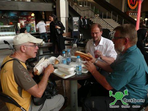 Zum Abendessen gingen wir in einen Imbiss. Niemand konnte Englisch und die Inhaber waren ganz aufgeregt, weil sie nicht wussten, was wir wollten. Mit Zeichensprache und Bildern konnten wir uns schließlich verständigen und es gab zuerst eine Suppe und dann einen Fleischspieß mit Beilagen und dazu für jeden einen Teller Reis. Zu Trinken bekamen wir je eine Fanta und das ganze zum Preis von umgerechnet 6 €. Geschmeckt hat es uns ganz ausgezeichnet.