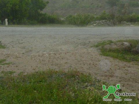 Die Landschaft war zunächst sehr abwechslungsreich und die Täler waren grün und saftig. Je höher wir kamen, umso karger wurde das Land nach knapp 60 km mündete unsere Landstraße wieder in der Autobahn und wir gewannen kontinuierlich an Höhe, bis wir unseren ersten Pass mit 2281 m erreichten. Wir verloren wieder gut 200 Höhenmeter, bevor es wieder aufwärts ging. Bis dahin hatten wir häufig günstigen Wind und wir kamen gut vorwärts. Die Temperatur lag bei 31°C als urplötzlich auf den letzten 17 km der Wind drehte und uns schier vom Rad blies. Kritisch wurde es immer, wenn ein LKW an uns vorbei fuhr, denn im Windschatten wurde man magisch angezogen. Da es auch noch stetig bergauf ging kamen wir kaum mehr vorwärts und benötigten für diese letzte Strecke mehr als 2 Stunden. Die Temperatur war in wenigen Minuten auf 13 °C abgesunken und zu allem Überdruss begann es auch noch zu regnen. An einem Polizeiposten bei der Abfahrt nach Dehbid (2320 m hoch) wurden wir angehalten. Sie wollten nur wissen, woher wir sind und wir nutzten die Gelegenheit, sie nach einem Hotel zu fragen. Nach langem Hin und Her setzte sich einer der Polizisten in sein Auto und brachte uns zu einem 4 Kilometer entfernten Hotel in Dehbid. Wir hätten dieses einzige Hotel wohl nie gefunden, da es für uns als Hotel nicht erkennbar war.