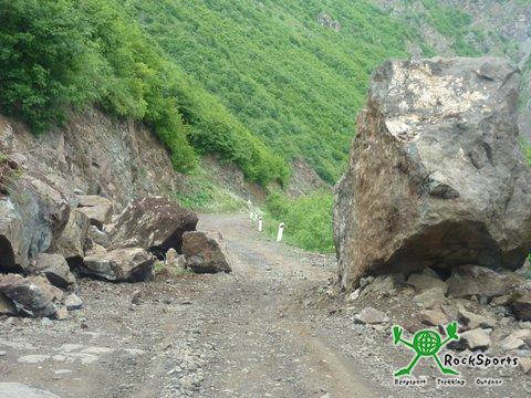 Den 2. Ruhetag nutzten wir dazu, einen Ausflug nach Kasbegi im Kaukasus zu machen. Zuerst fuhren wir mit dem Taxi zum Busbahnhof. Von dort ging es in einem Minibus zunächst auf guter, später aber recht abenteuerlicher Strecke auf der alten Heerstraße bis auf mehr als 2400 m Höhe hinauf. Für die 155 km lange Strecke benötigte unser rasant fahrender Minibus 3 Stunden. Diese alte Heerstraße verbindet Georgien mit Russland. Der Grenzübergang ist aber nur für bestimmte Nationen geöffnet. Unterwegs behinderten immer wieder riesige