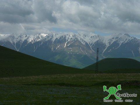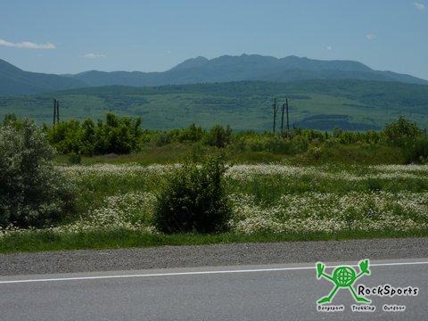 Obwohl es nicht immer so lief wie wir es uns vorstellten war es ein herrlicher Tag. Der extreme Gegenwind vom Vortag hatte nachgelassen. Zwar hatten wir auch heute den ganzen Tag über Gegenwind, aber dieser war zu verkraften. Dafür aber hatten wir traumhaftes Wetter mit einer sehr guten Fernsicht. Unsere Strecke zieht sich in einem breiten Tal zwischen dem Kleinen Kaukasus und dem Großen Kaukasus dahin. Heute konnten wir die leuchtenden Eisgipfel der Vier- und Fünftausender erkennen und davor die herrlich blühenden und duftenden Wiesen genießen.