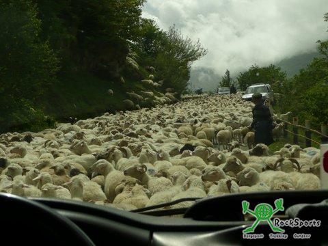 Schaf- und Ziegenherden den Verkehr auf der Straße, da die Herden auf die Sommerweiden des Großen Kaukasus getrieben wurden. Von Kasbegi aus hatten wir mächtige Berge vor uns aber leider war der Blick auf den Kasbek, den mit etwas mehr als 5000 m zweithöchsten Gipfel Armeniens, von Wolken verdeckt.