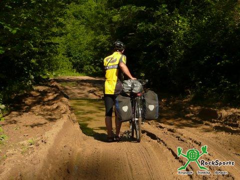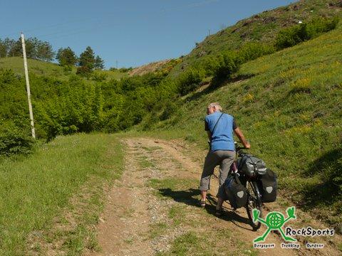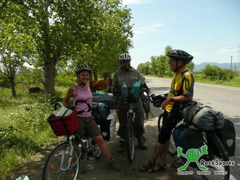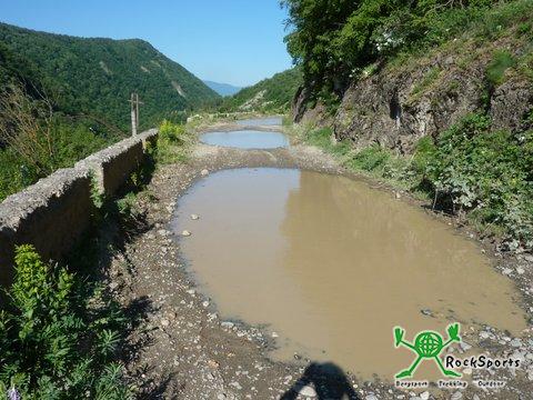 Schon um 7 Uhr starteten wir heute, um etwa zur Mittagszeit in Kutaisi zu sein. Nach 2 Kilometern bogen wir von der Hauptstraße auf eine Nebenstrecke ab, um dem Verkehr zu entgehen. Dafür handelten wir uns ein anderes Problem ein. Nach 200 Metern endete der geteerte Weg und mündete in eine Piste aus groben Steinen, Wasserläufen und tiefen Wasserpfützen. Einmal mussten wir die Schuhe ausziehen und durch eine riesige schlammige Wasserpfütze die Räder durchschieben. Bis über die Knöchel standen wir im Schlamm und die Räder waren total verdreckt und mit Schlamm überzogen. Zum Glück kam kurze Zeit später ein Brunnen, an dem wir uns und die Räder wieder einigermaßen säubern konnten. So ging es über eine Strecke von 40 Kilometern, für die wir mehr als 5 Stunden benötigten. Als wir dann nach 50 Kilometern wieder die Hauptstraße erreichten waren wir froh, wieder auf einer vernünftigen Straße fahren zu dürfen. Kurz hinter Zestaponi trafen wir zwei Fernradler, ein Pärchen aus Bremen und Mexico, die Richtung Osten unterwegs waren. Wir unterhielten uns längere Zeit und tauschten Erfahrungen aus, bevor es weiter ging nach Kutuaisi, das wir erst kurz nach 17 Uhr erreichten. Da Kutaisi und seine Umgebung einiges zu bieten hat, werden wir hier 2 Nächte verbringen.