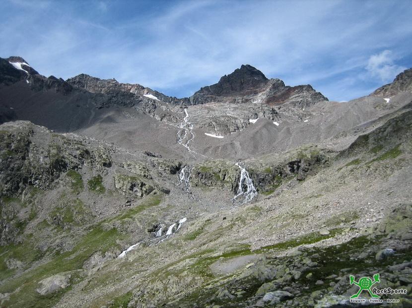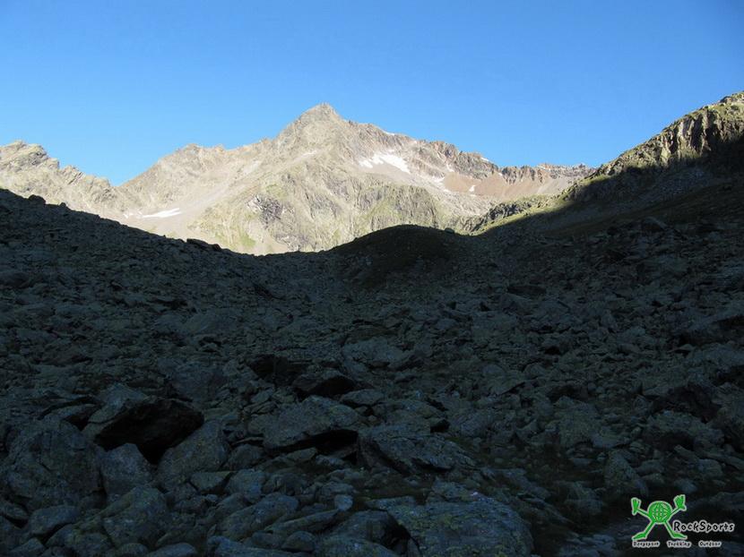Von dort geht es nicht mehr so gut markiert weiter. Am linken Rand vom Grieskogelferner im Schutt und leichtem Blockgelände geht es immer Richtung der gut sichtbaren Steilstufe. In den Führern und alten Berichten wird die Tour noch über den Gletscher beschrieben, mittlerweile ist dies durch den stark zurück gegangenen Ferner nicht mehr notwendig und speziell kurz vor der Steilstufe auch nicht mehr Empfehlenswert, da einige Steine herunter kamen.
