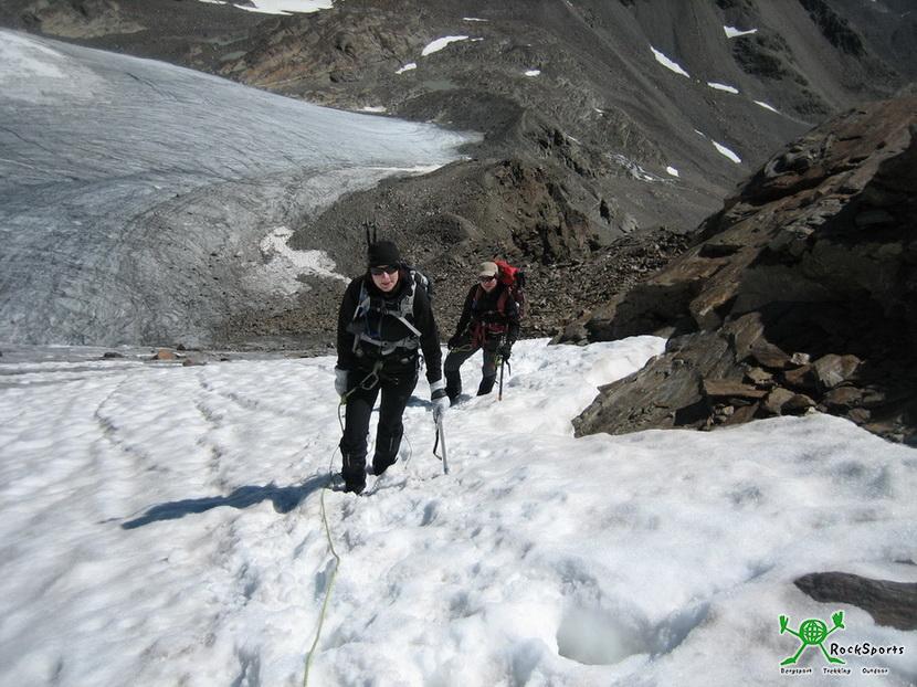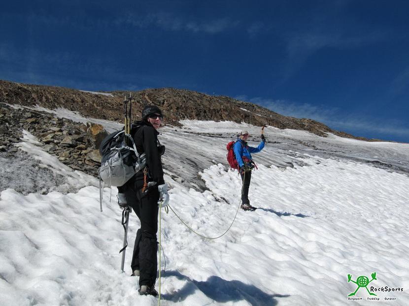 An der Steilstufe zogen wir unser Gurtzeug, Steigeisen und Seil an und am linken Rand auf dem Schuttrücken ging es hoch. Danach geht es über den flacheren Gletscher, den Spalten ausweichend weiter Richtung Gipfel.