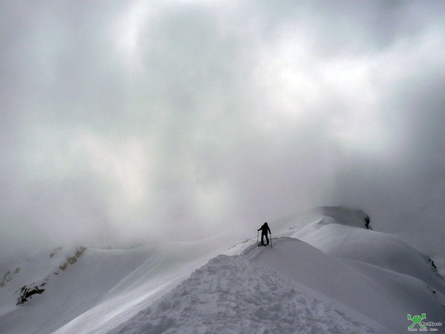 Nach dieser kurzen Klettersteig Einlage geht es problemlos über flache Südhänge zum Gipfel des Großen Daumen (2280 m). Um nun die Einfahrt zur Nordabfahrt zu erreichen bleibt man direkt am Grat und quert rüber in Richtung Kleiner Daumen. Die Einfahrt befindet sich in der Gegend wo der Grat steiler in die Scharte zwischen Großem und Kleinem Daumen abbricht.