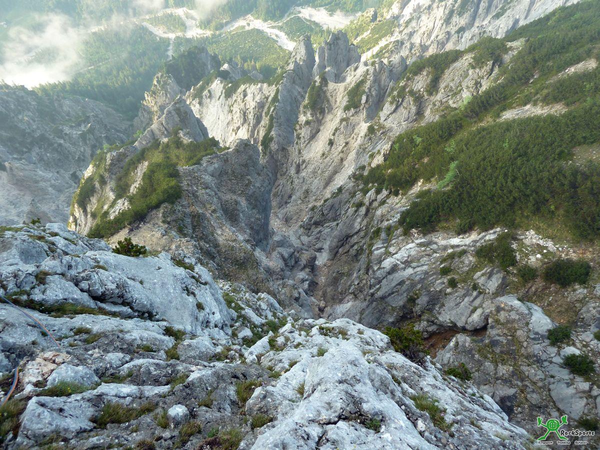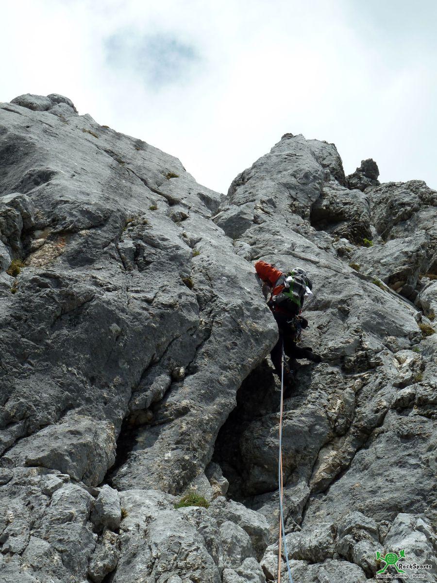 Vom Absatz über herrliche Wasserrillen (V-) und zerfressenen Fels in eine breite schrofige Rinne. In der Rinne (II-III) empor bis zum Beginn eines schräg nach rechts ziehenden Riss. Insgesamt ca. 70 m, Zwischenstand an 2 NH möglich.