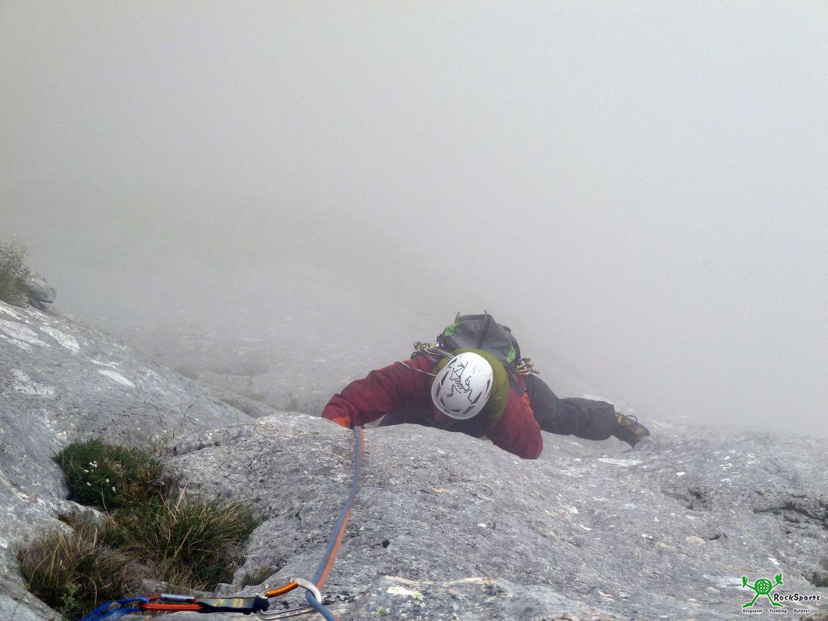 Mit Suchen und Umherklettern im noch aus der Nacht total nassen schrofigen Gelände hat diese Passage ganze 1,5 h gedauert und erst gegen 08:45 Uhr steigen wir in die eigentliche Südverschneidung ein. Die 1. SL (V+, 35m) stellt eine äußerst steile Rissverschneidung dar und es wird einem gleichmal aufgezeigt wie der Hase hier läuft und was eine alpine V+ alles so darstellen kann! Die 2. SL (V, 15 m) ist lediglich etwas leichter dafür aber fast noch etwas unangenehmer da sehr schlecht absicherbar. Glatter und heute leider etwas nasser Kamin. Die ersten beiden Seillängen können zusammengefast werden.