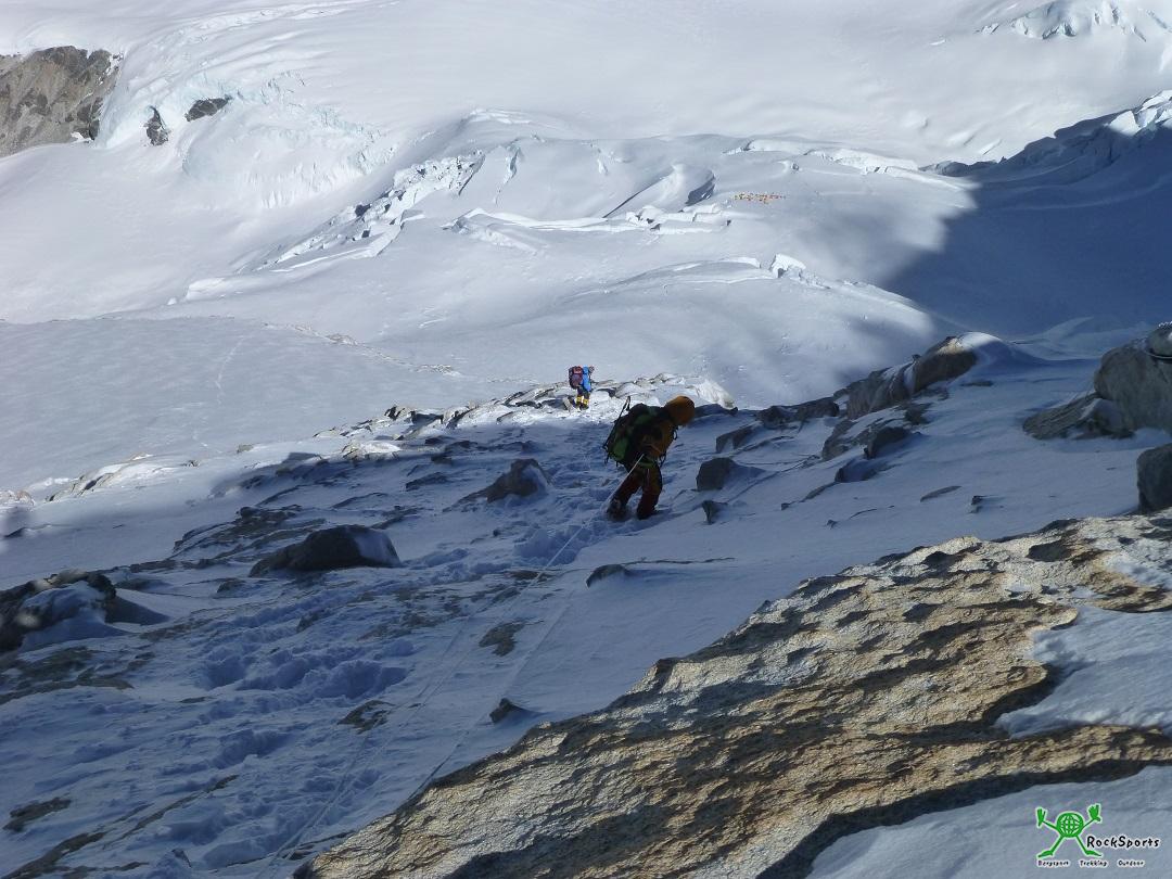 Im French Couloir waren bei meiner Begehung nur bis 8350m neue Fixseile angebracht. Daher machten die meisten Gipfelaspiranten am 17.5. auch kehrt. Auf etwa 8300m konnte ich auf Mike Horn aufschließen und ihn überholen. Das French Couloir ist weniger ein Couloir, vielmehr eine Felsrippe, vom Anspruch vergleichbar mit dem Stüdlgrat auf den Großglockner. Auf den Gipfelgrat kommt man erst kurz vor dem letzten, nochmal anspruchsvollen Aufschwung zum Vorgipfel.