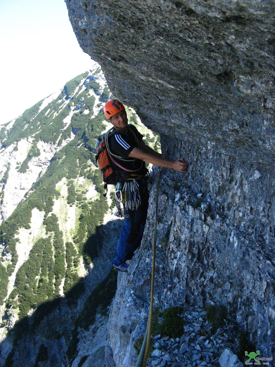 In der Ausstiegsseillänge (nochmals eine Stelle VI+ im Quergang)