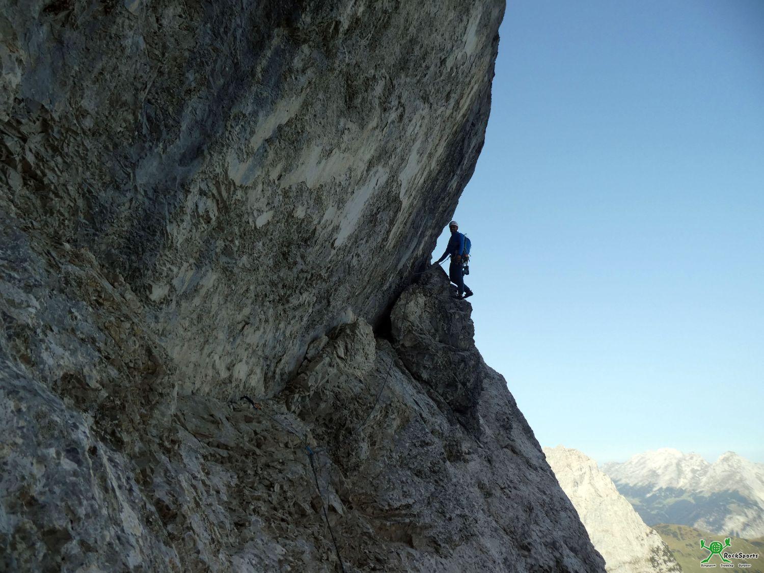 21. Seillänge (IV) – Ab hier wartete am 3. Sanierungstag wieder komplettes Neuland auf uns und die „Sanierungs-Arbeit“ begann. Es folgt der zwei Seillängen Quergang nach rechts hinaus auf der logisch vorgegebenen bandartigen Verwerfung. Der Quergang ist teilweise brüchig aber trotzdem gut gangbar.